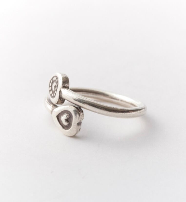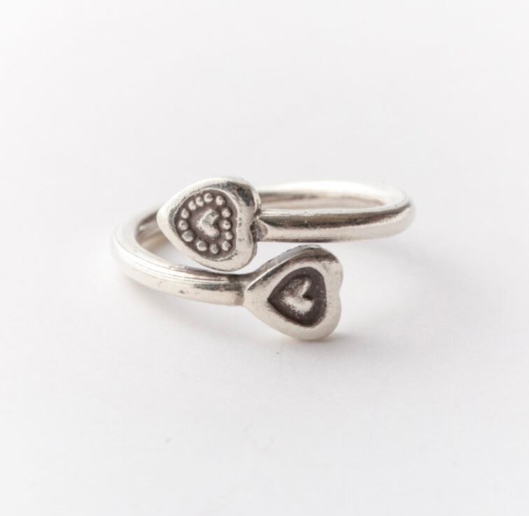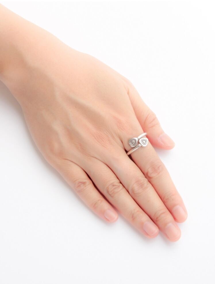カレンシルバーを使用したダブルハートの中にタイプの違うハートが彫られたリングです。