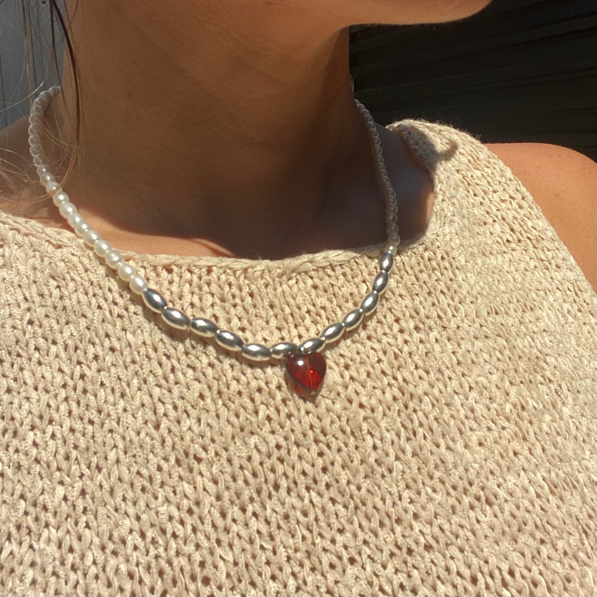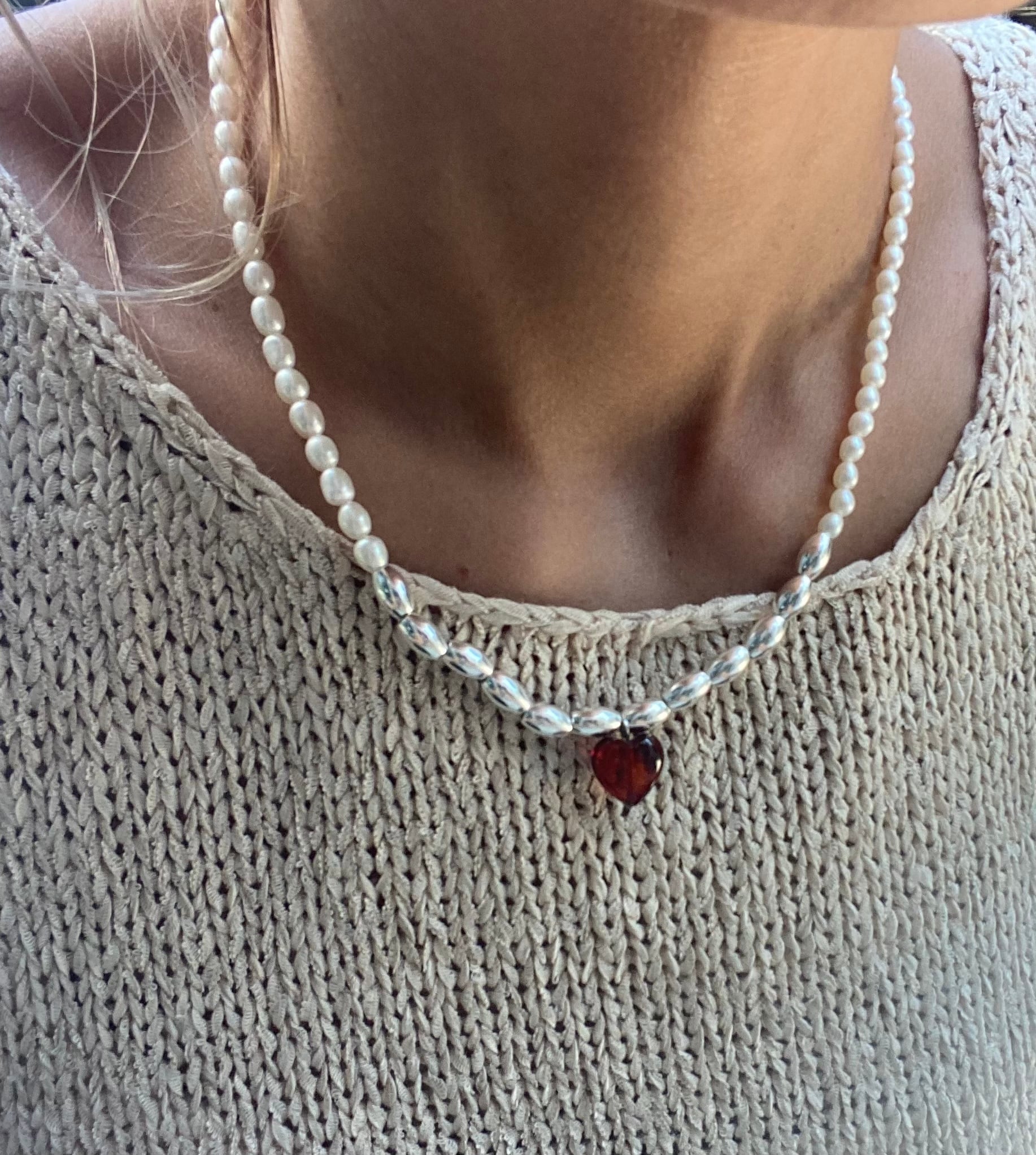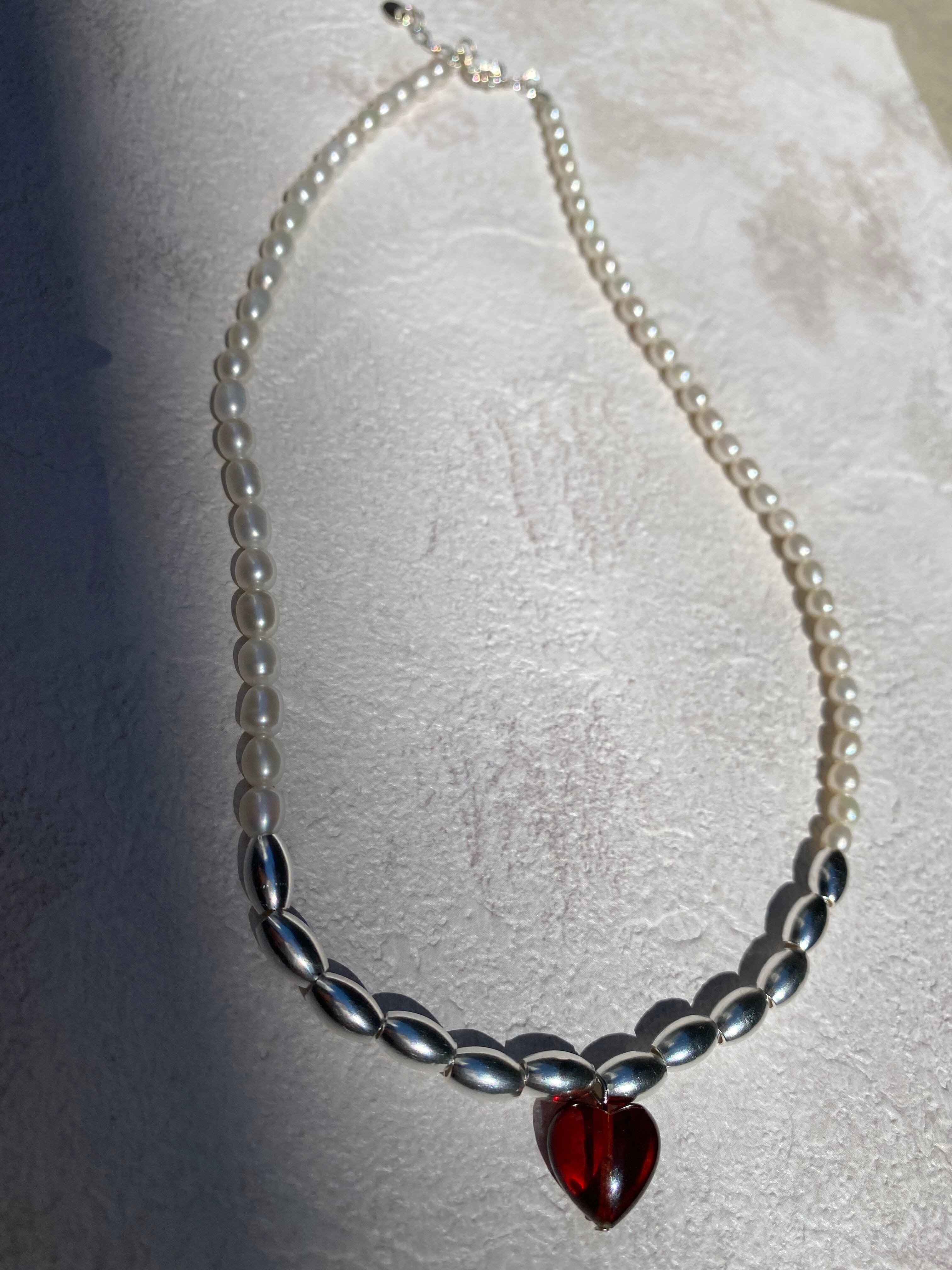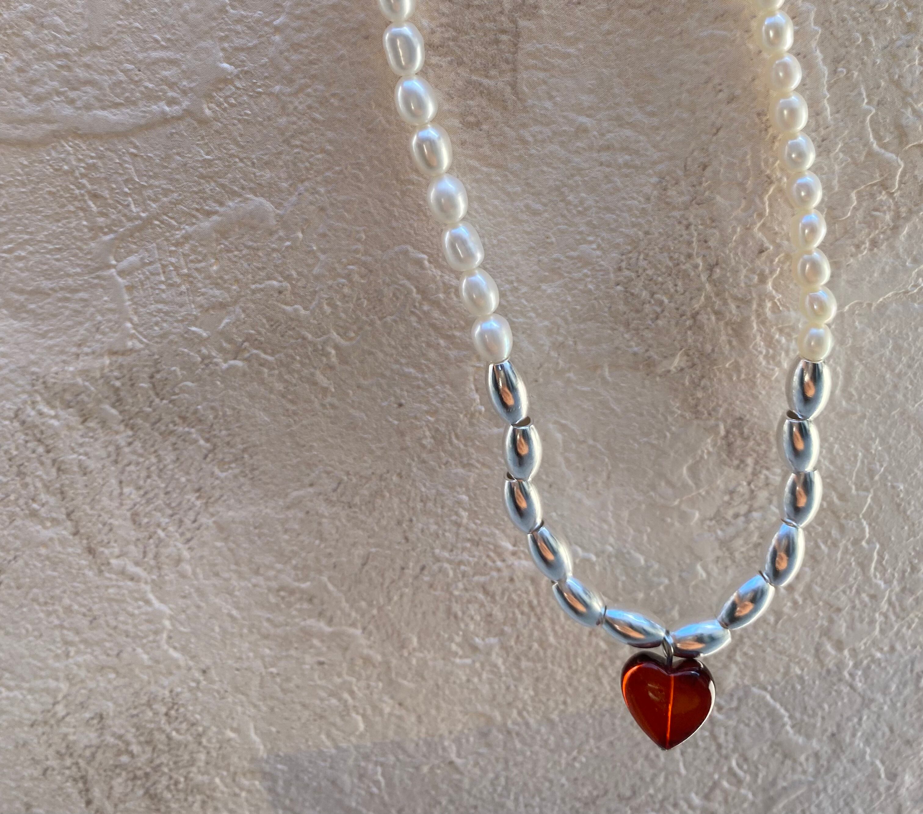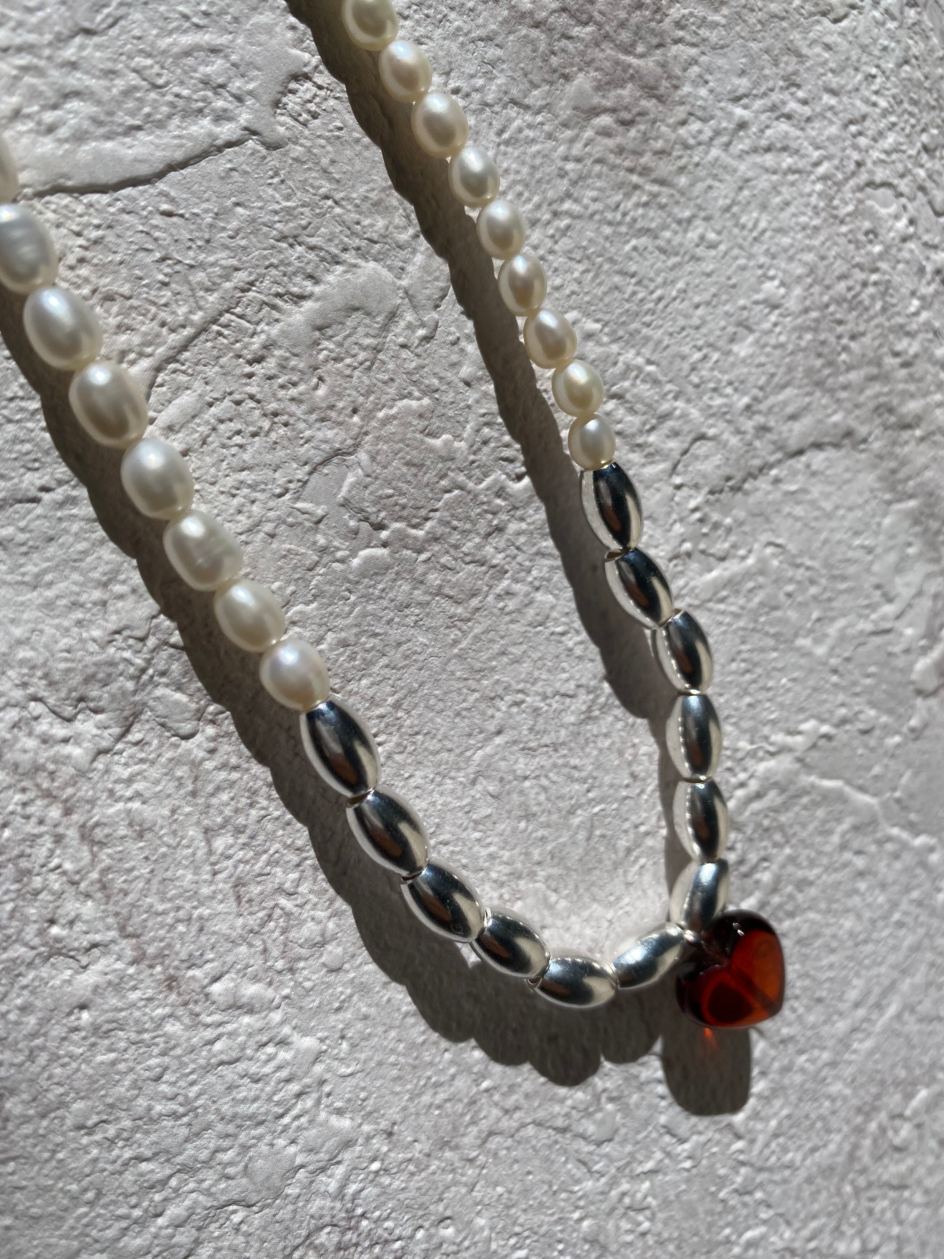 琥珀のハートチャームがキレイな天然パールネックレスです。