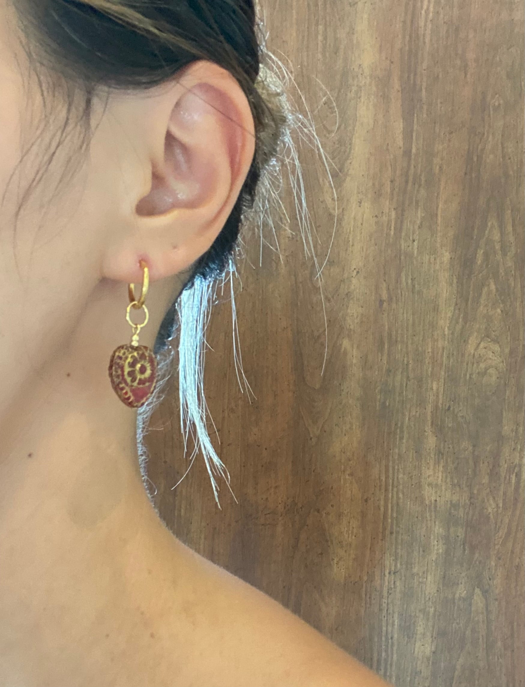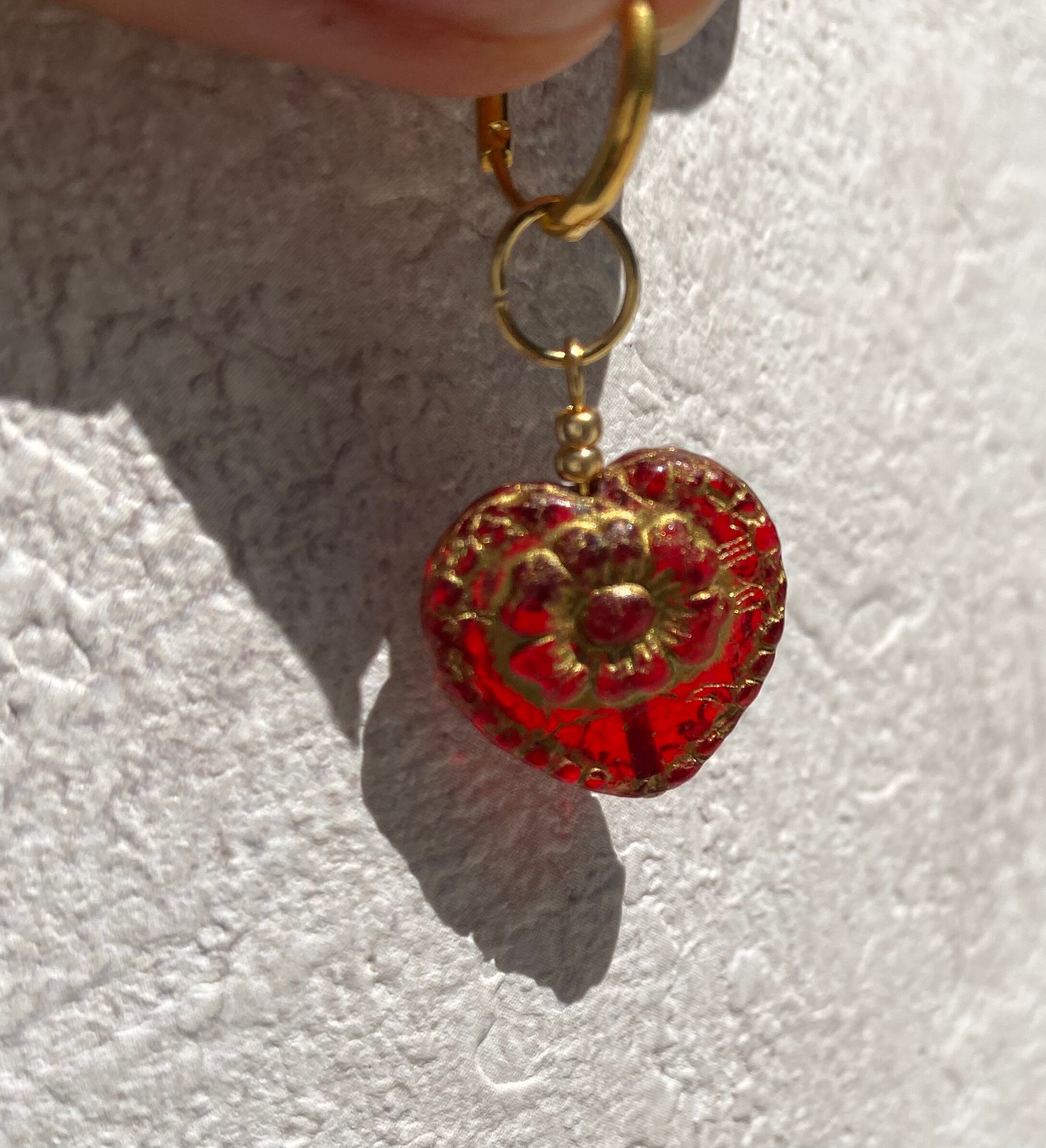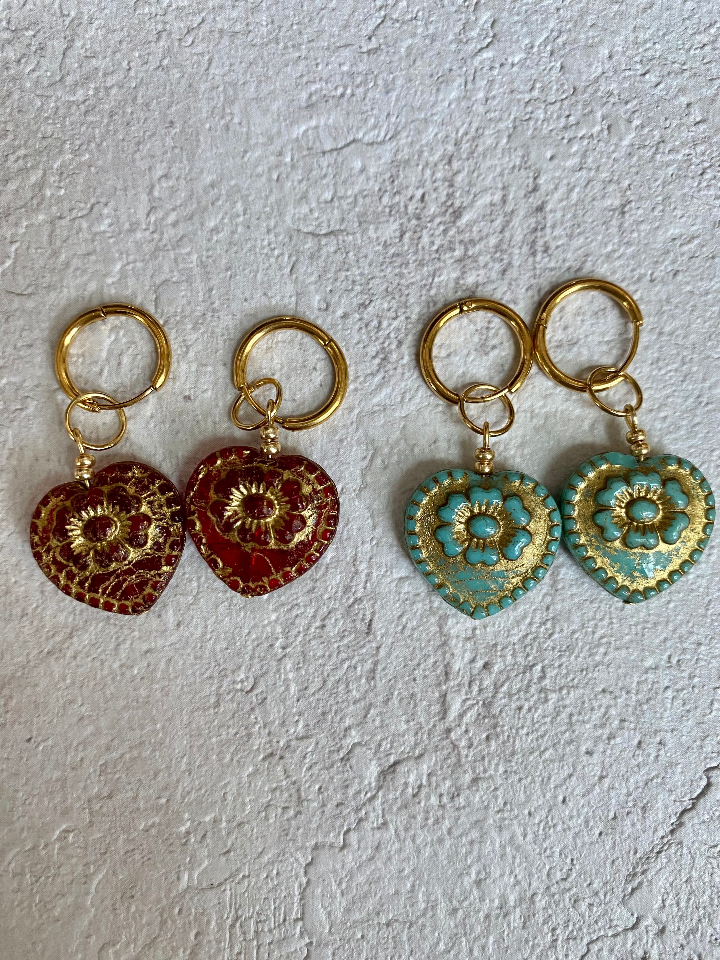 ゴールドの彫りとフラワーの柄が入った、アンティークな風合いのハート型チェコガラスビーズのピアスです。