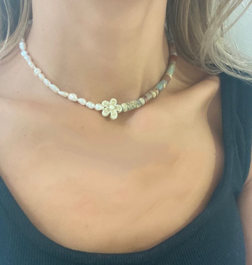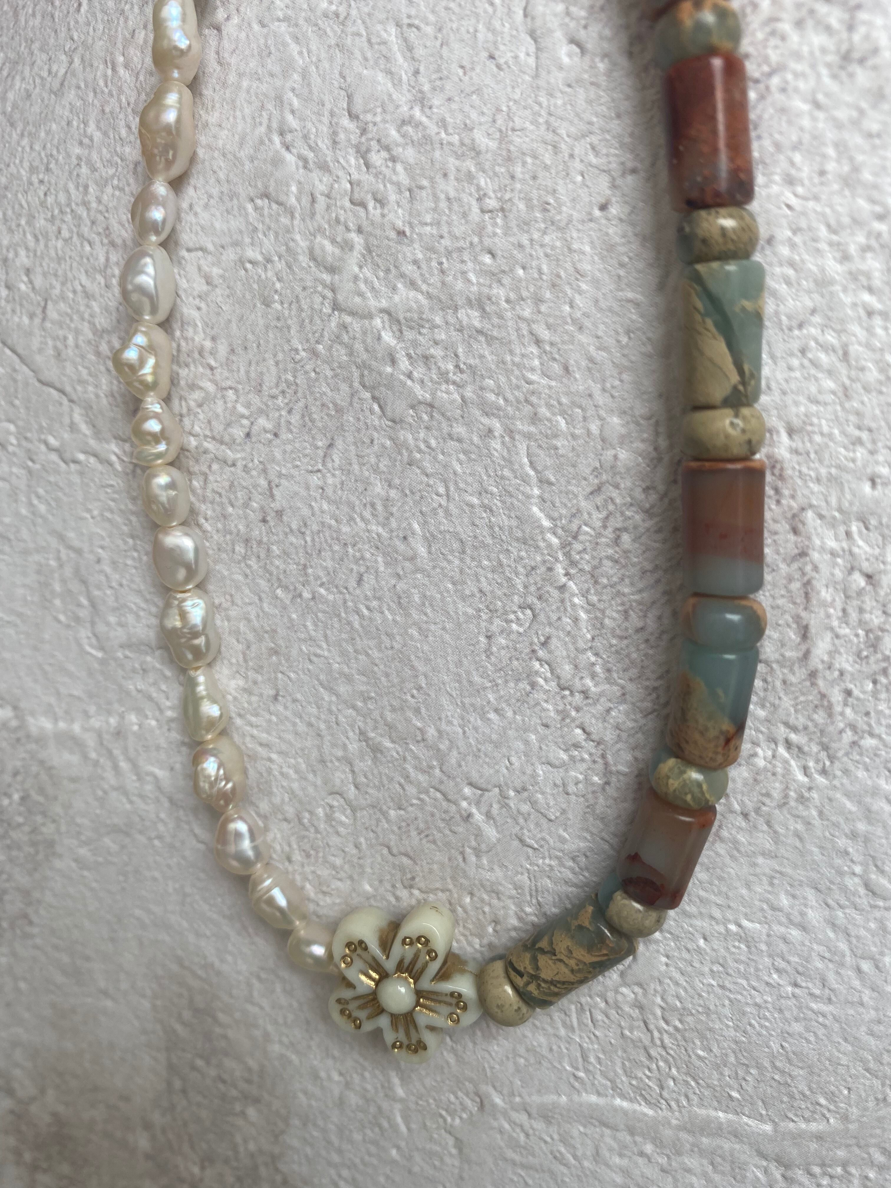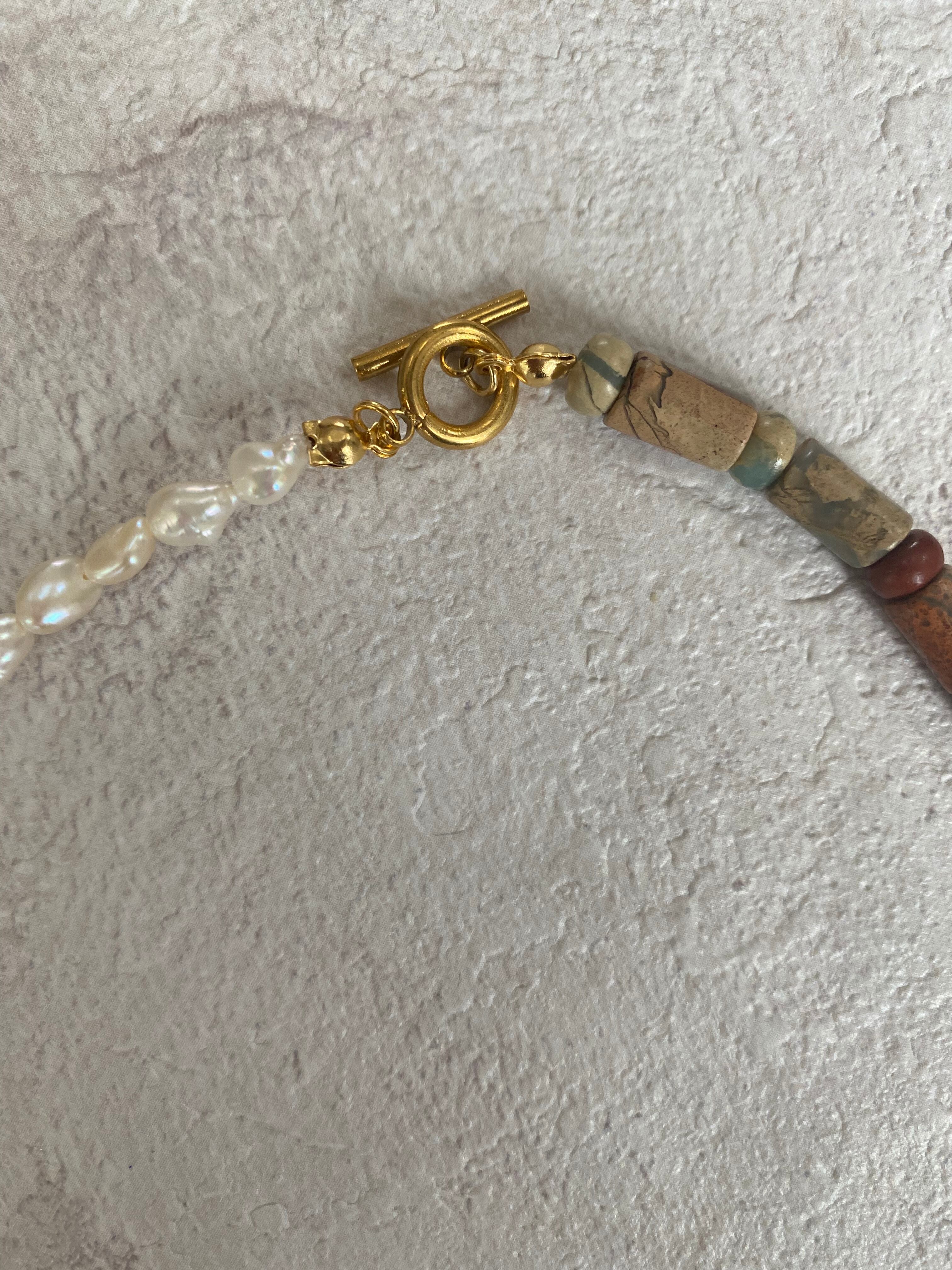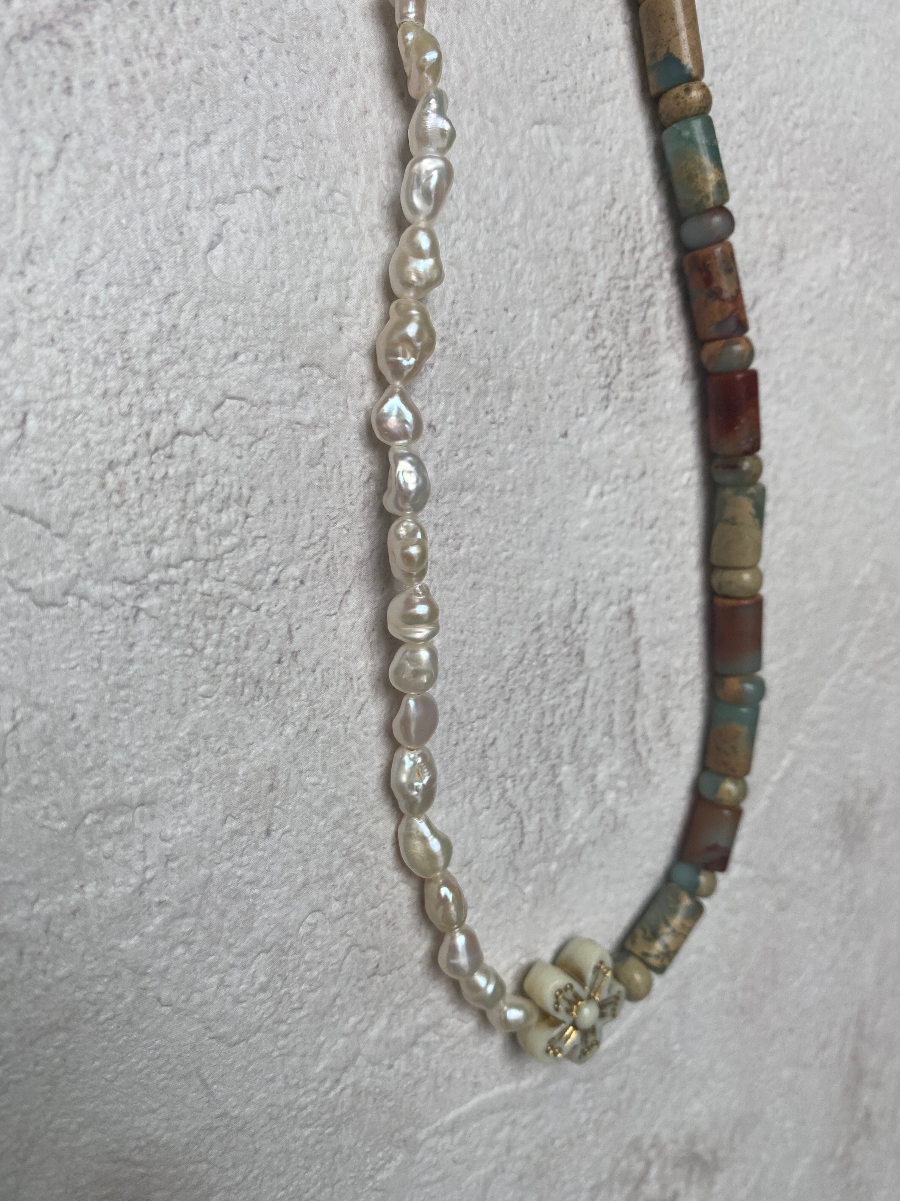 ツヤ感のある淡いブルーグリーンにマットなベージュやブラウンが絶妙に混ざり合うインプレッションストーンがキレイです。