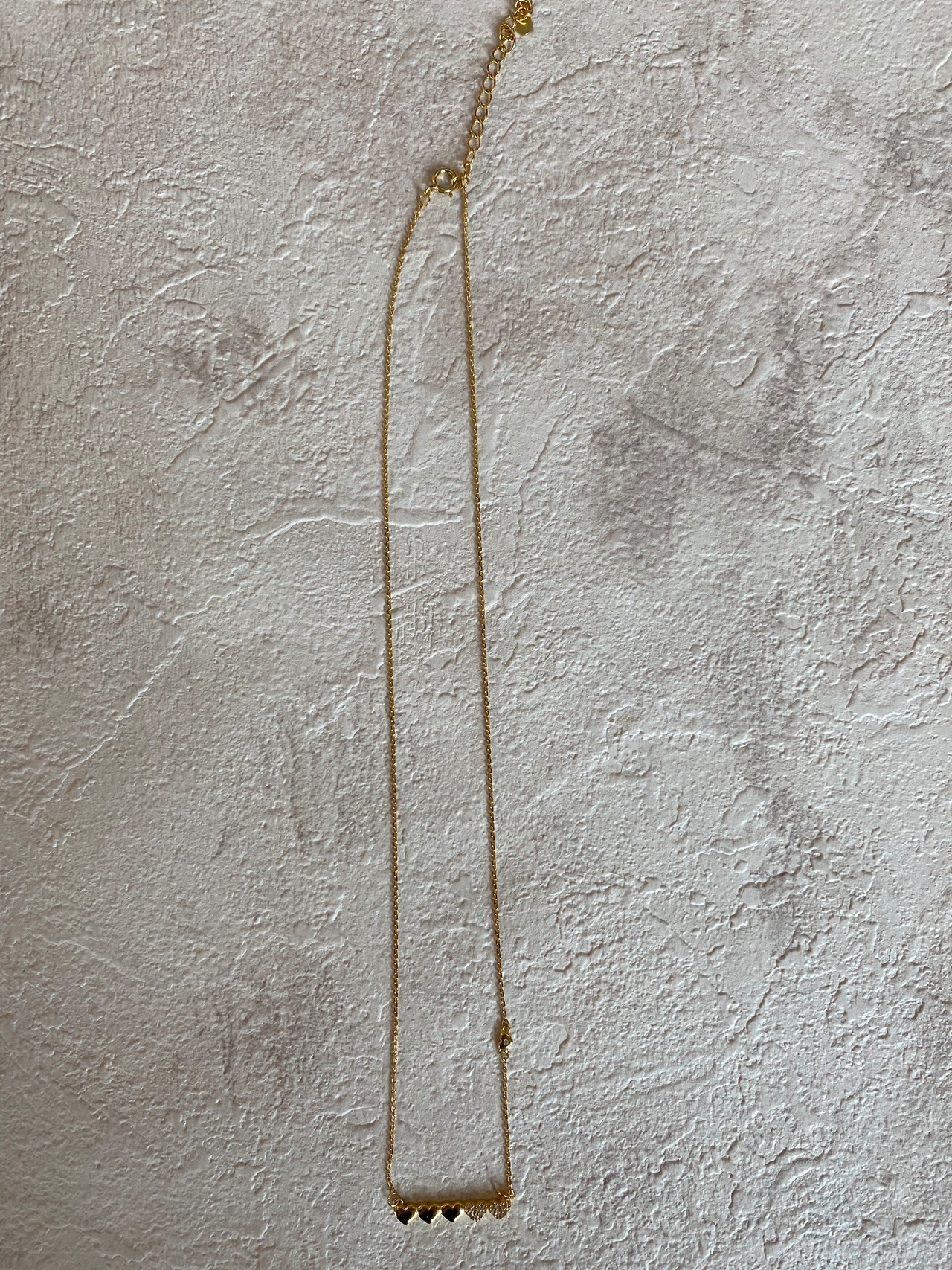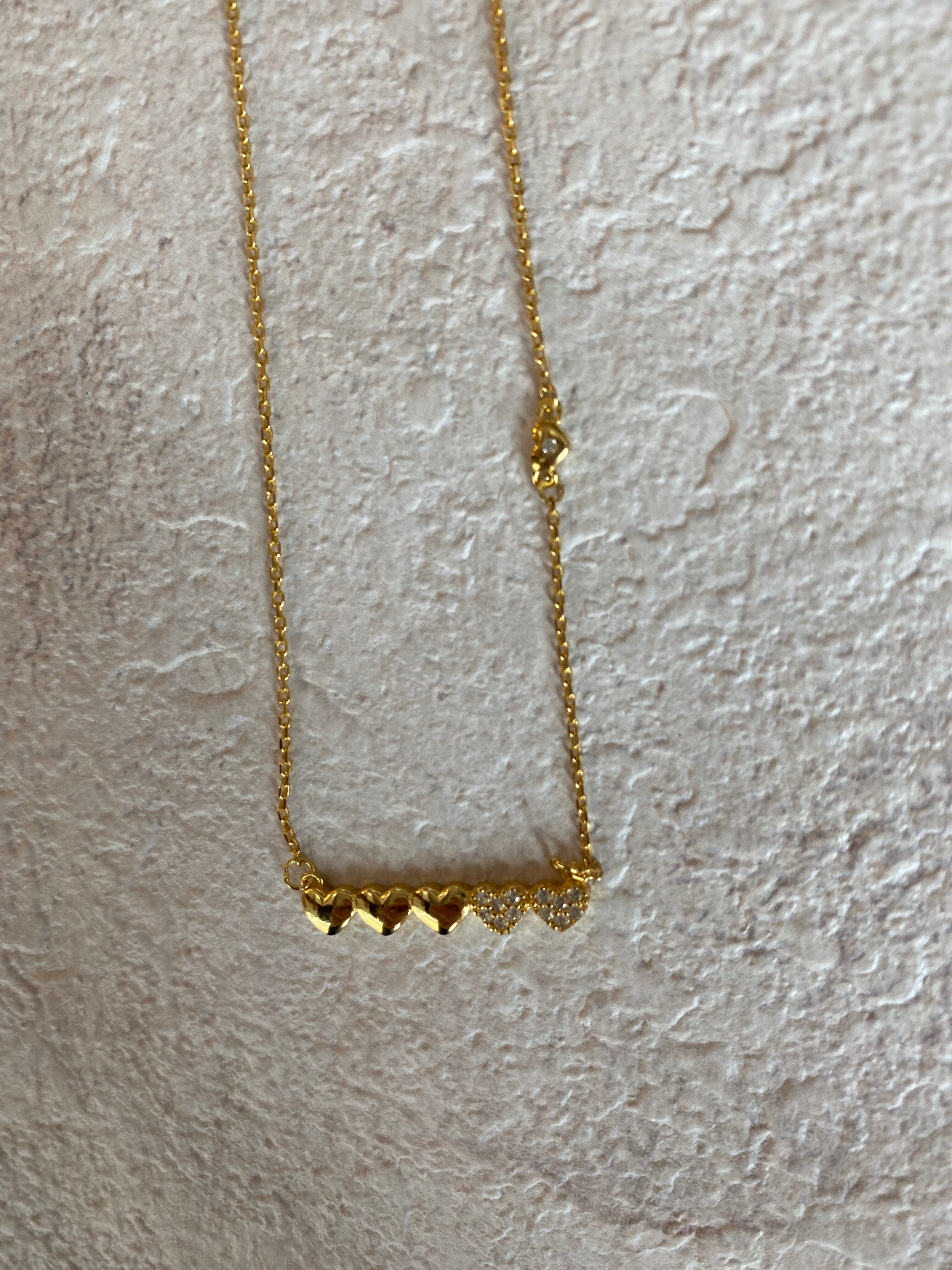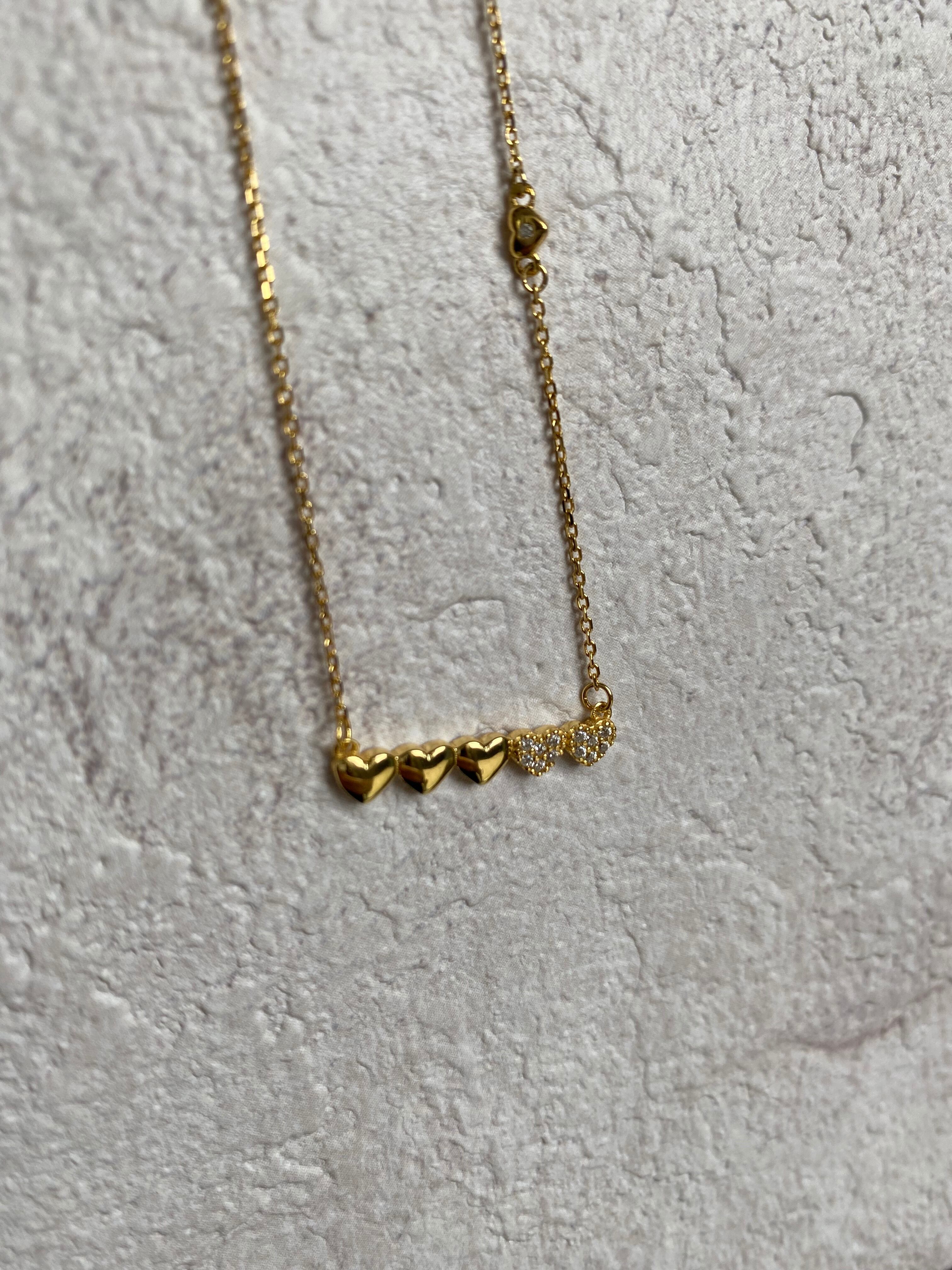 2つはキュービックジルコニアが敷き詰めてあり、チェーンの小さなハートにもキュービックジルコニアが一粒あります。