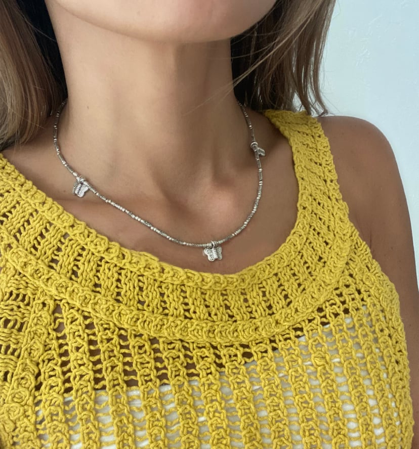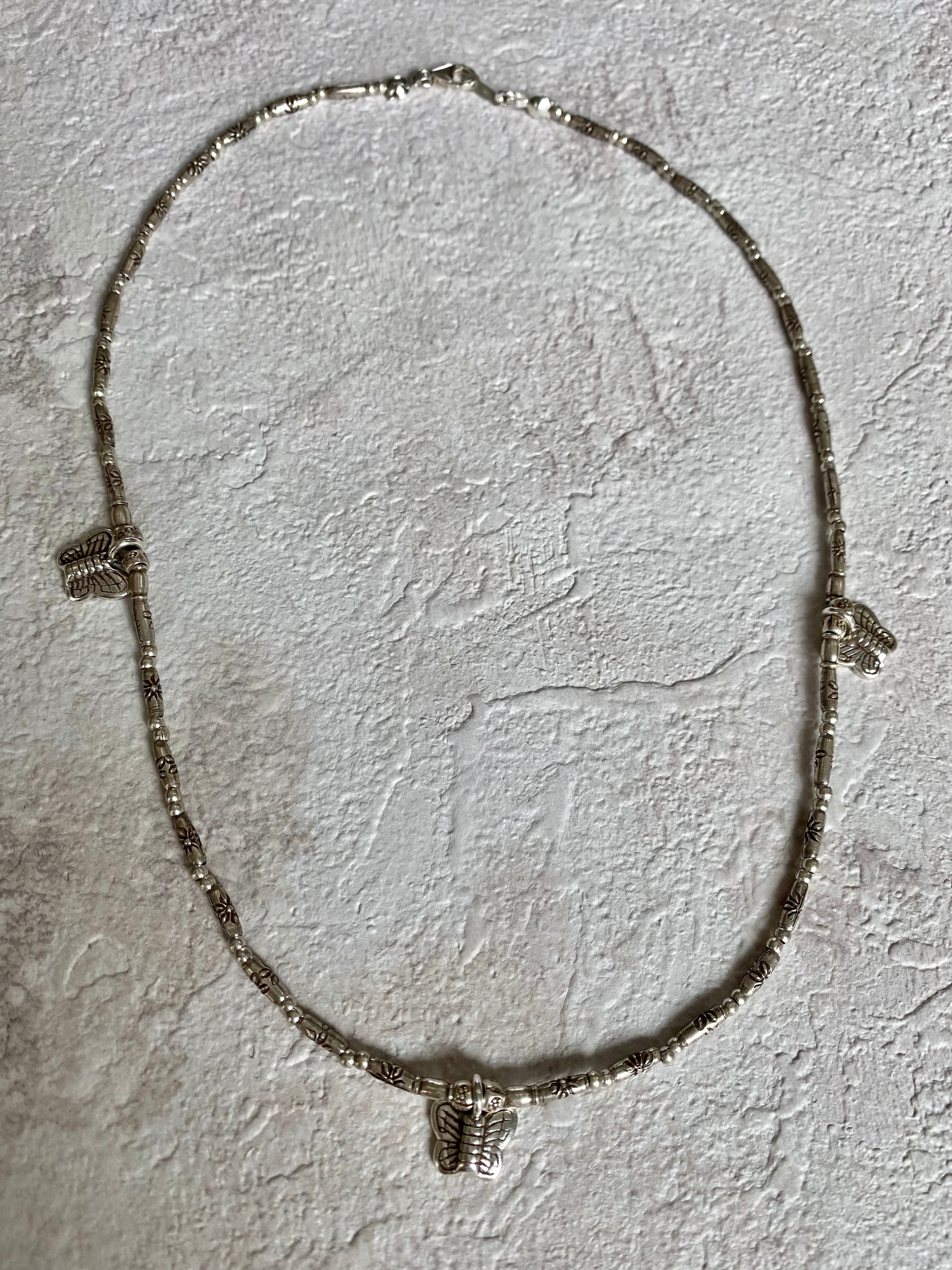 一つ一つ柄の入ったチューブにカジュアルなバタフライチャームが3つのカレンシルバーネックレスです。