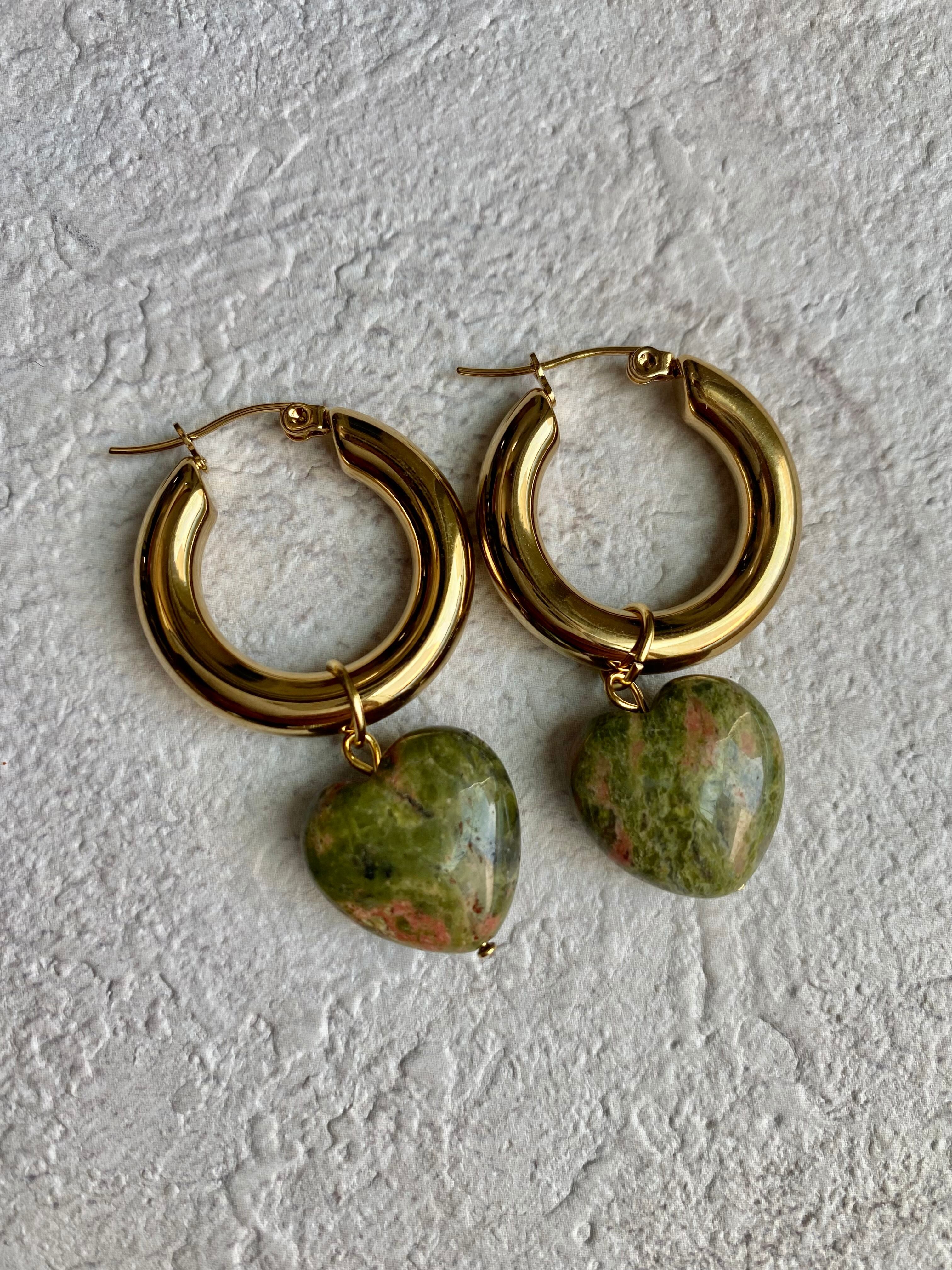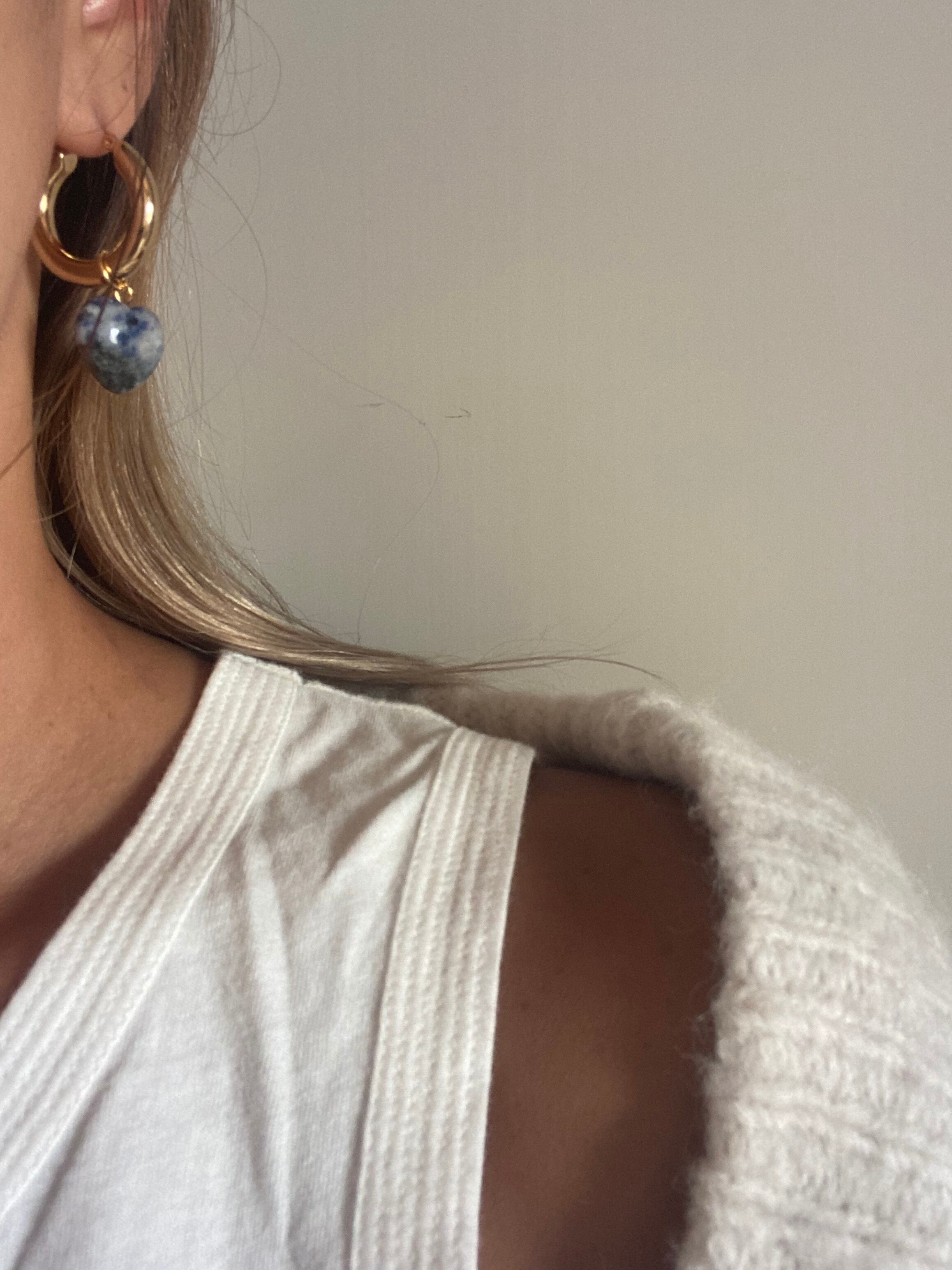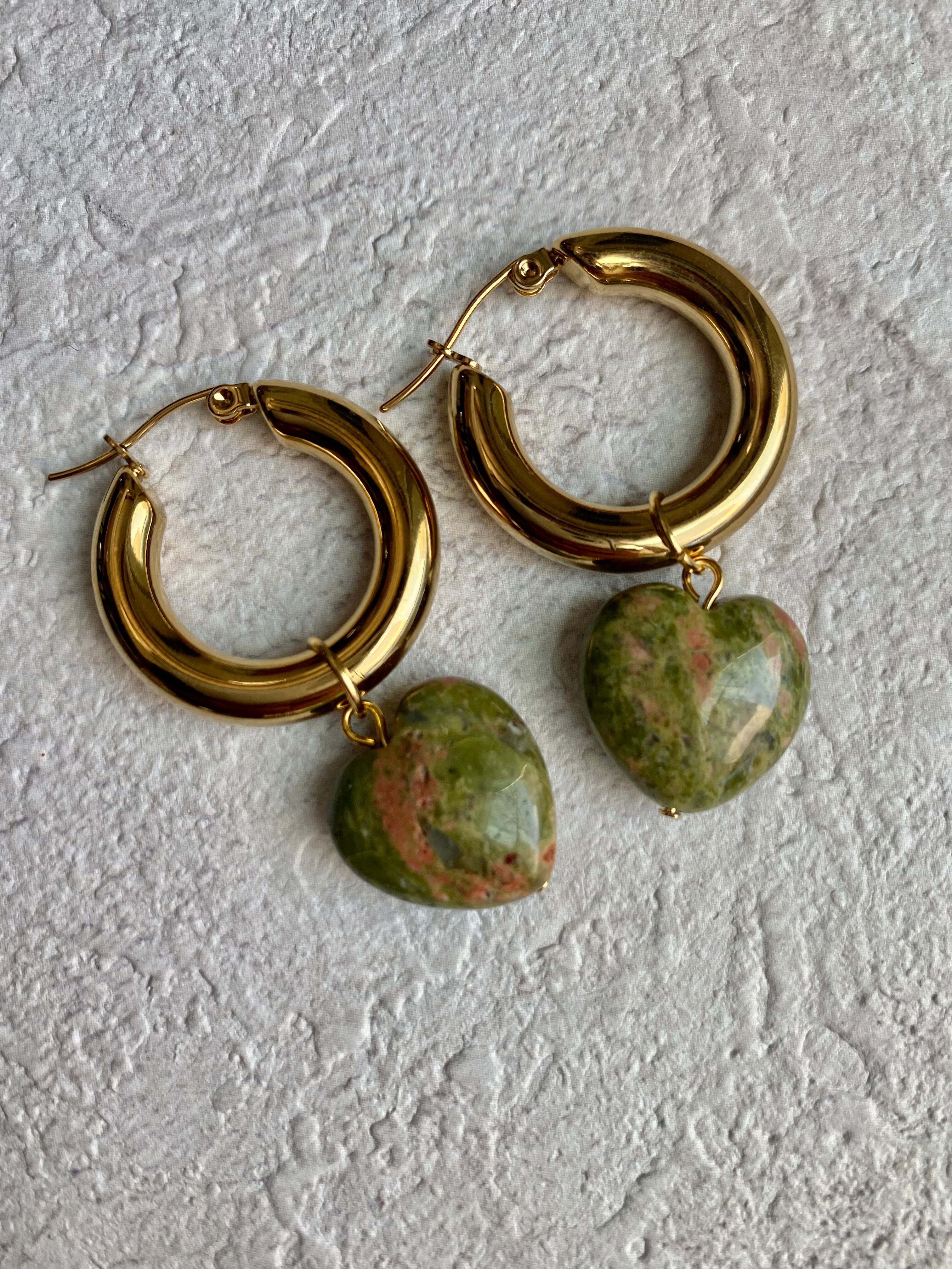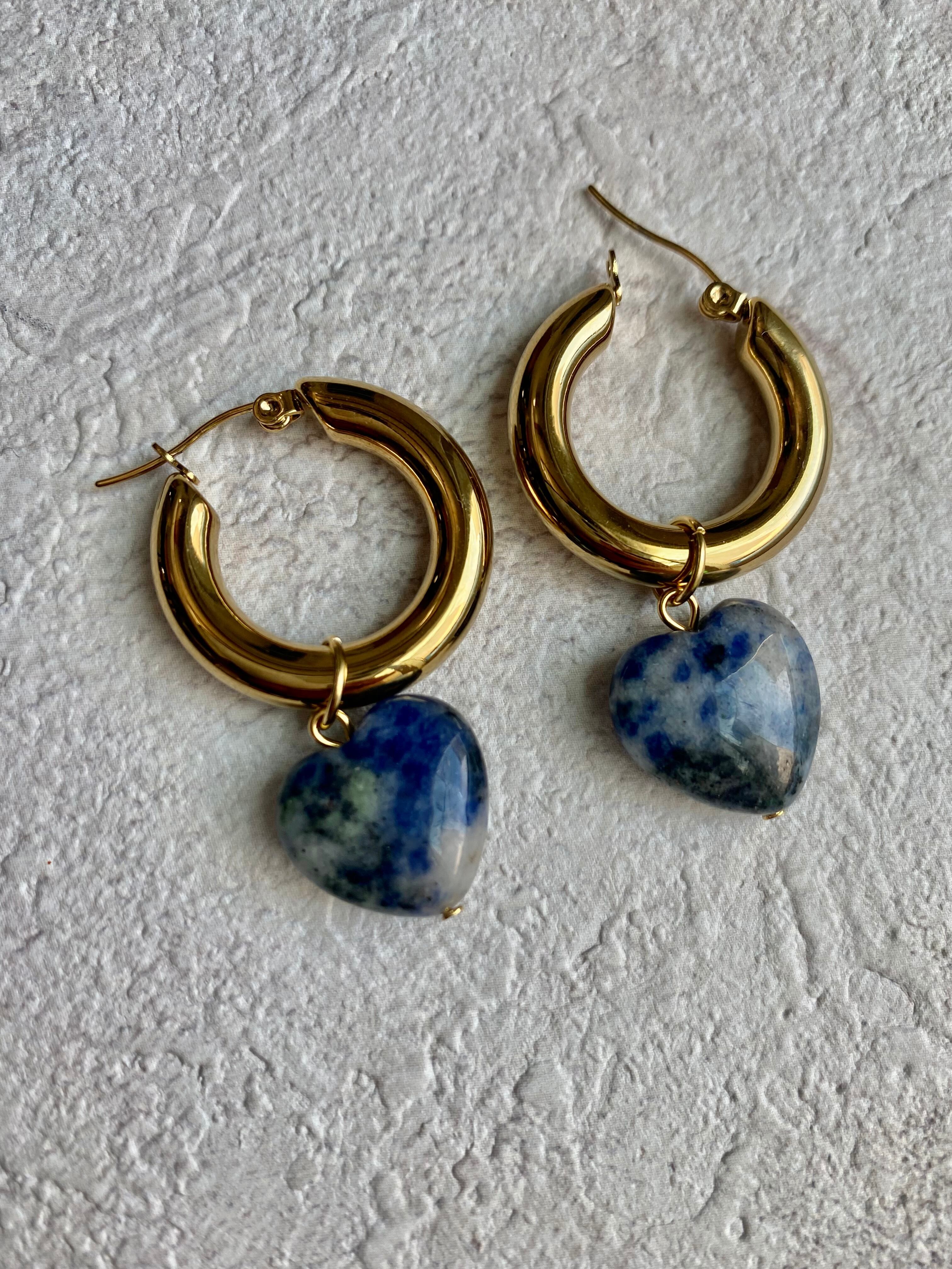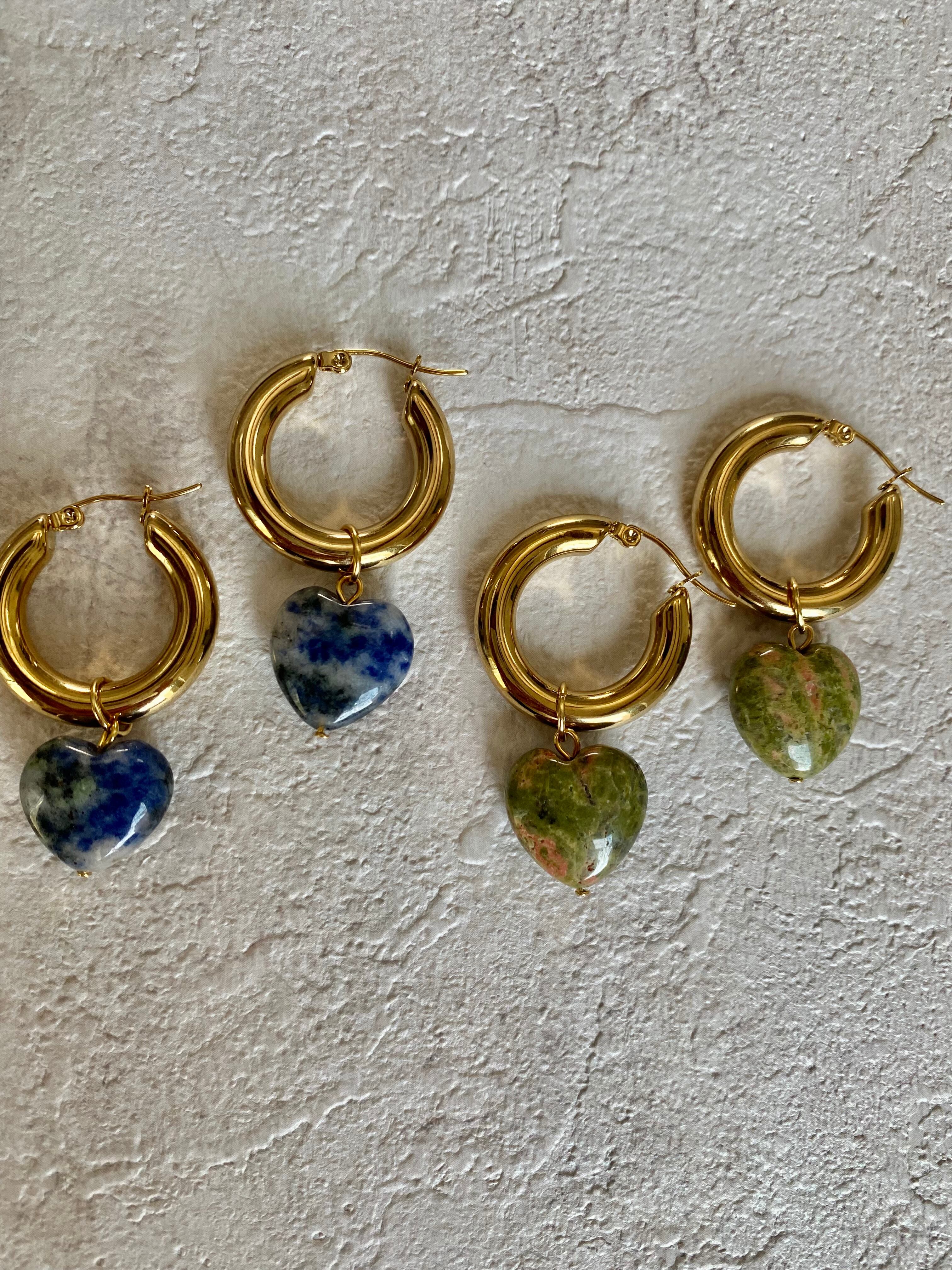 ブルースポットジャスパー(ブルー)とユナカイト(グリーン)の天然石がゆらゆら揺れるチャンキーフープピアスです。