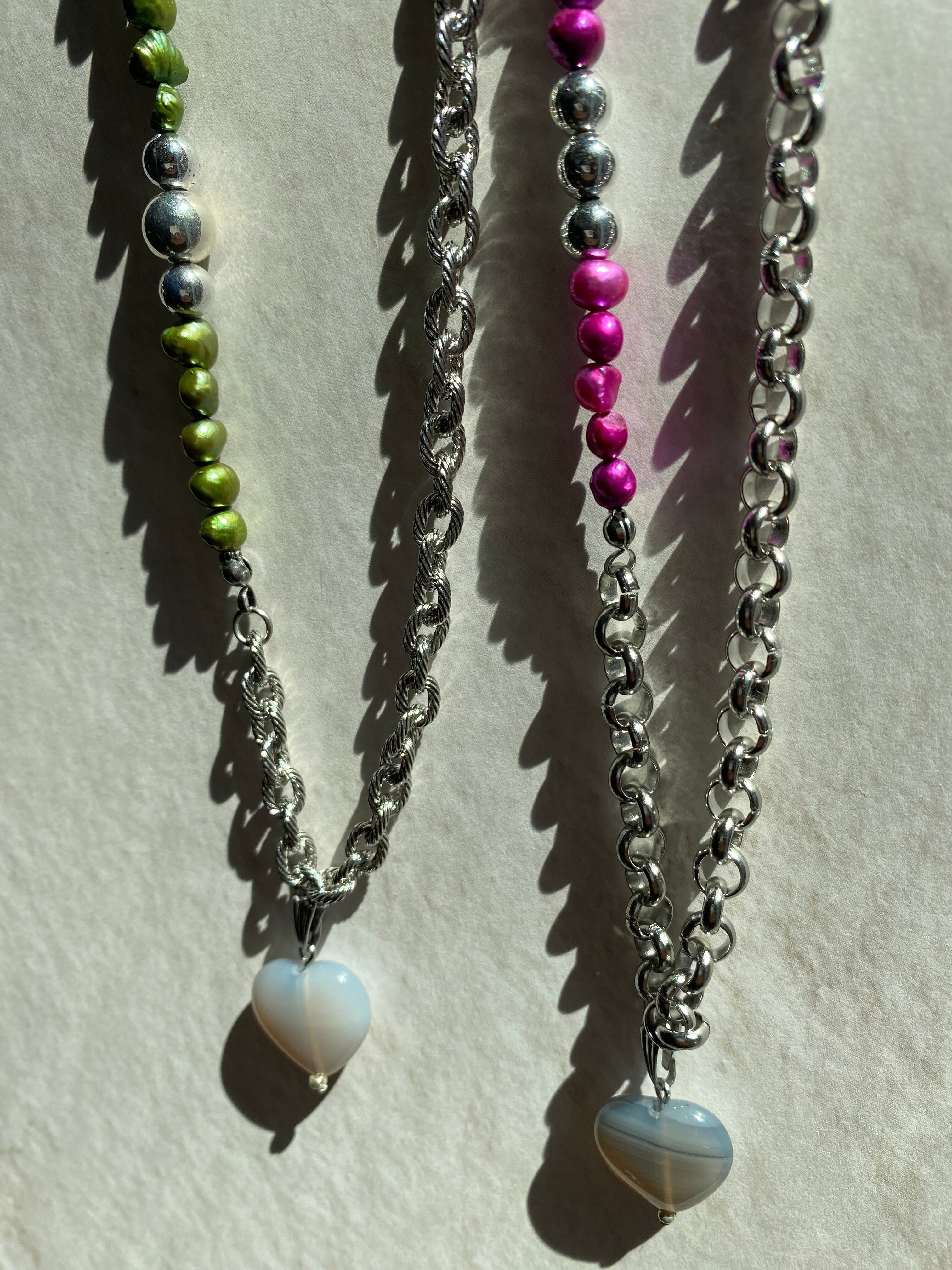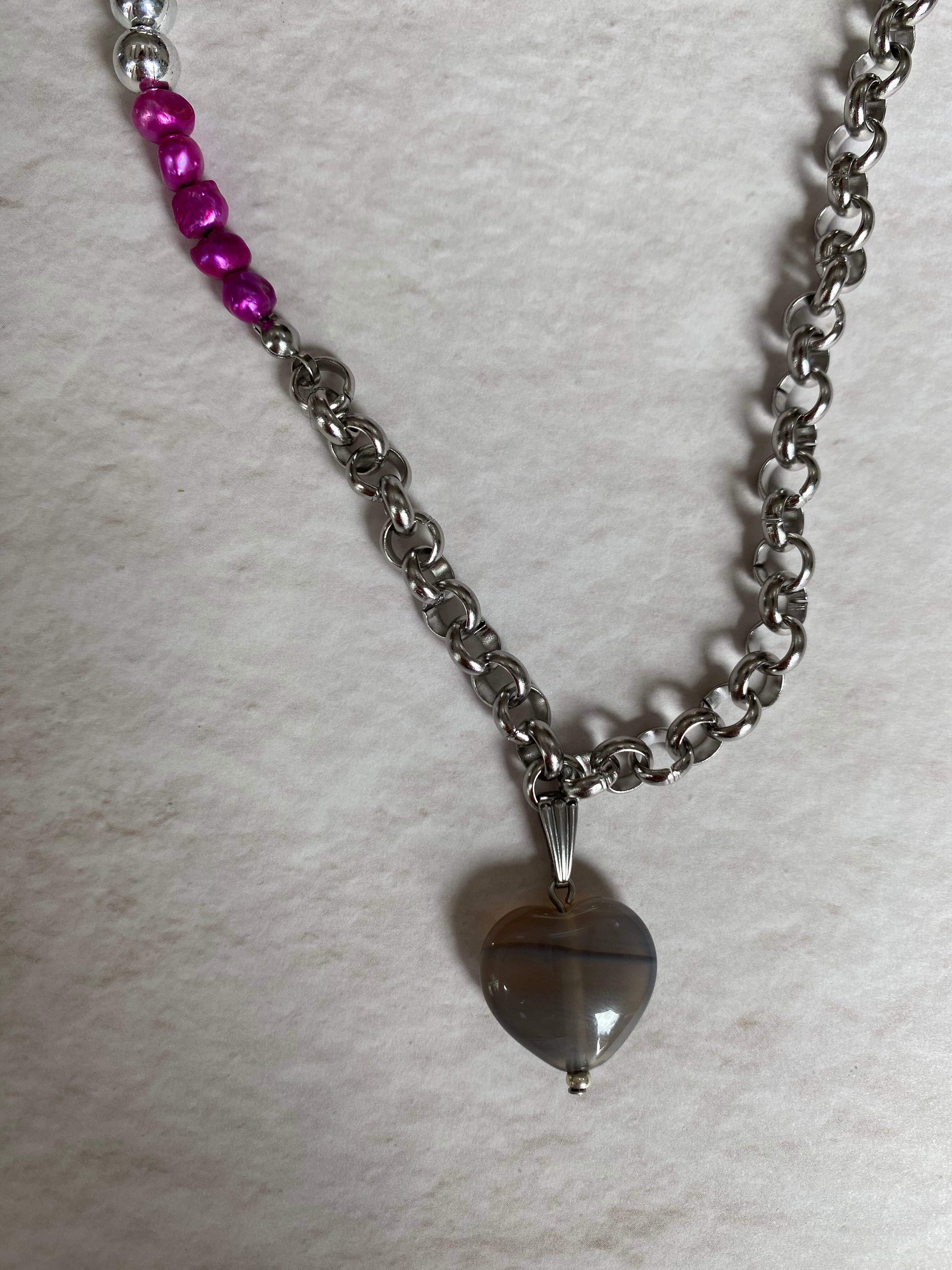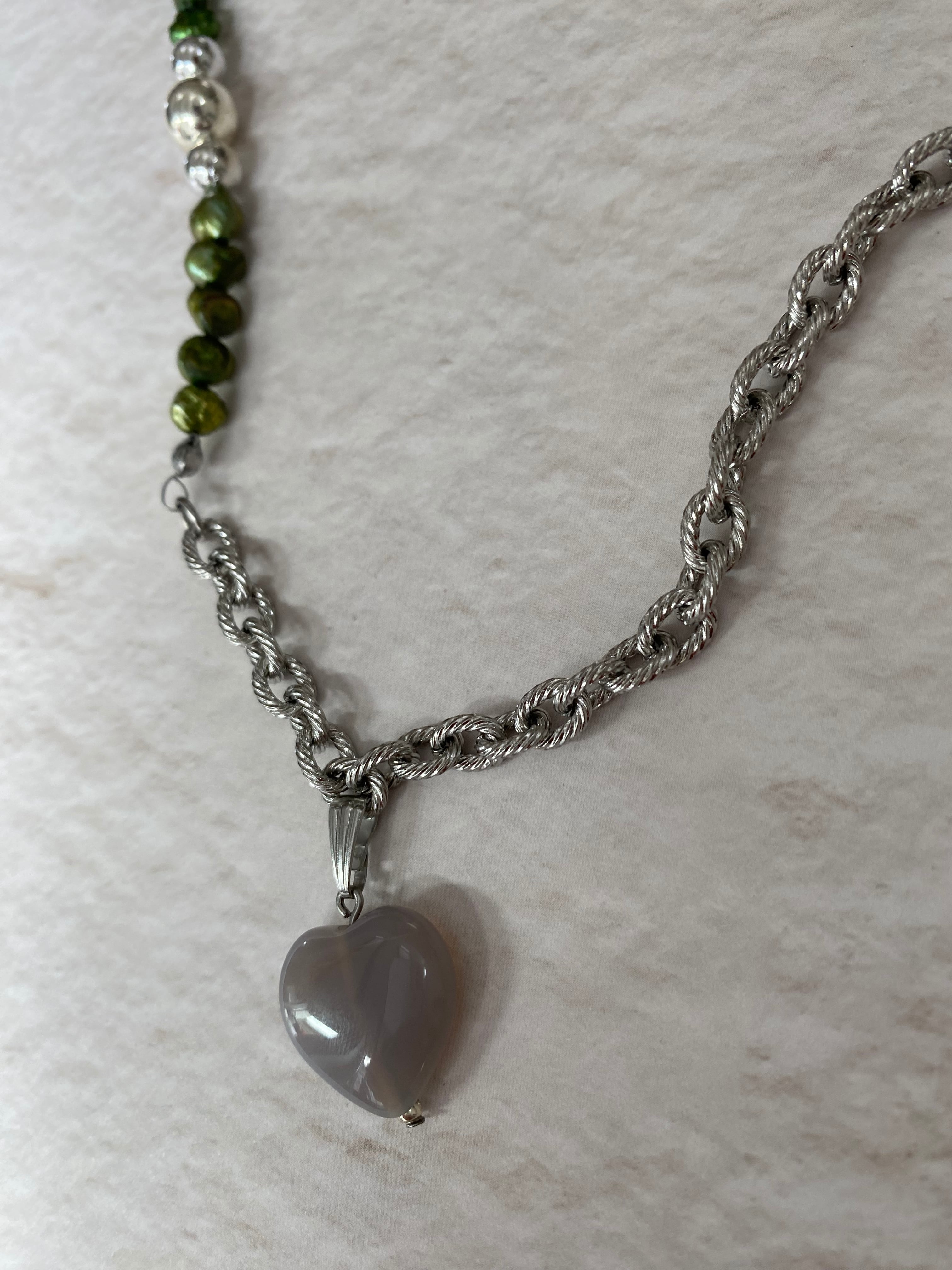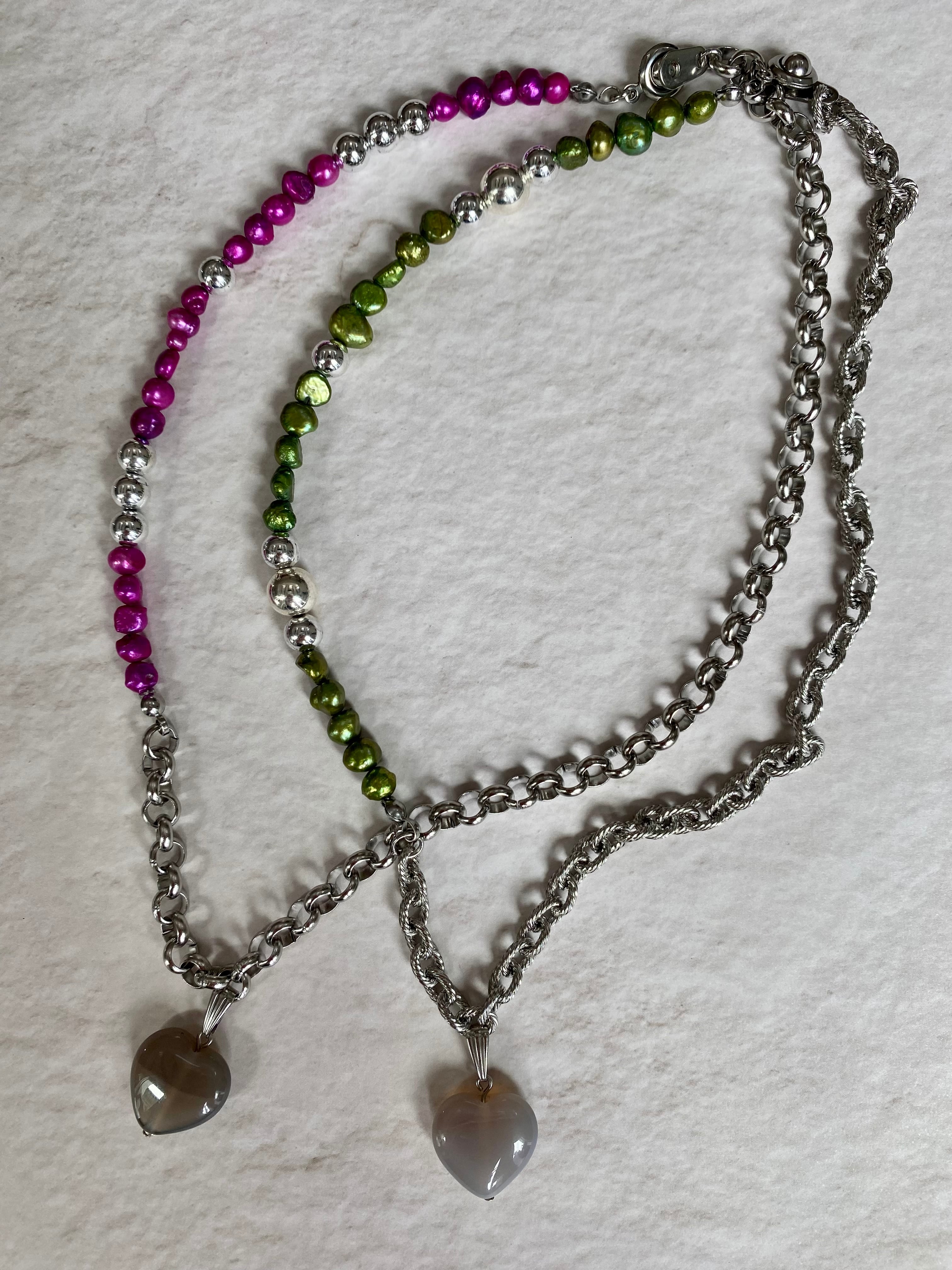 ハートのグレーアゲート、チェーンとカラー淡水パールを使用したネックレスです。