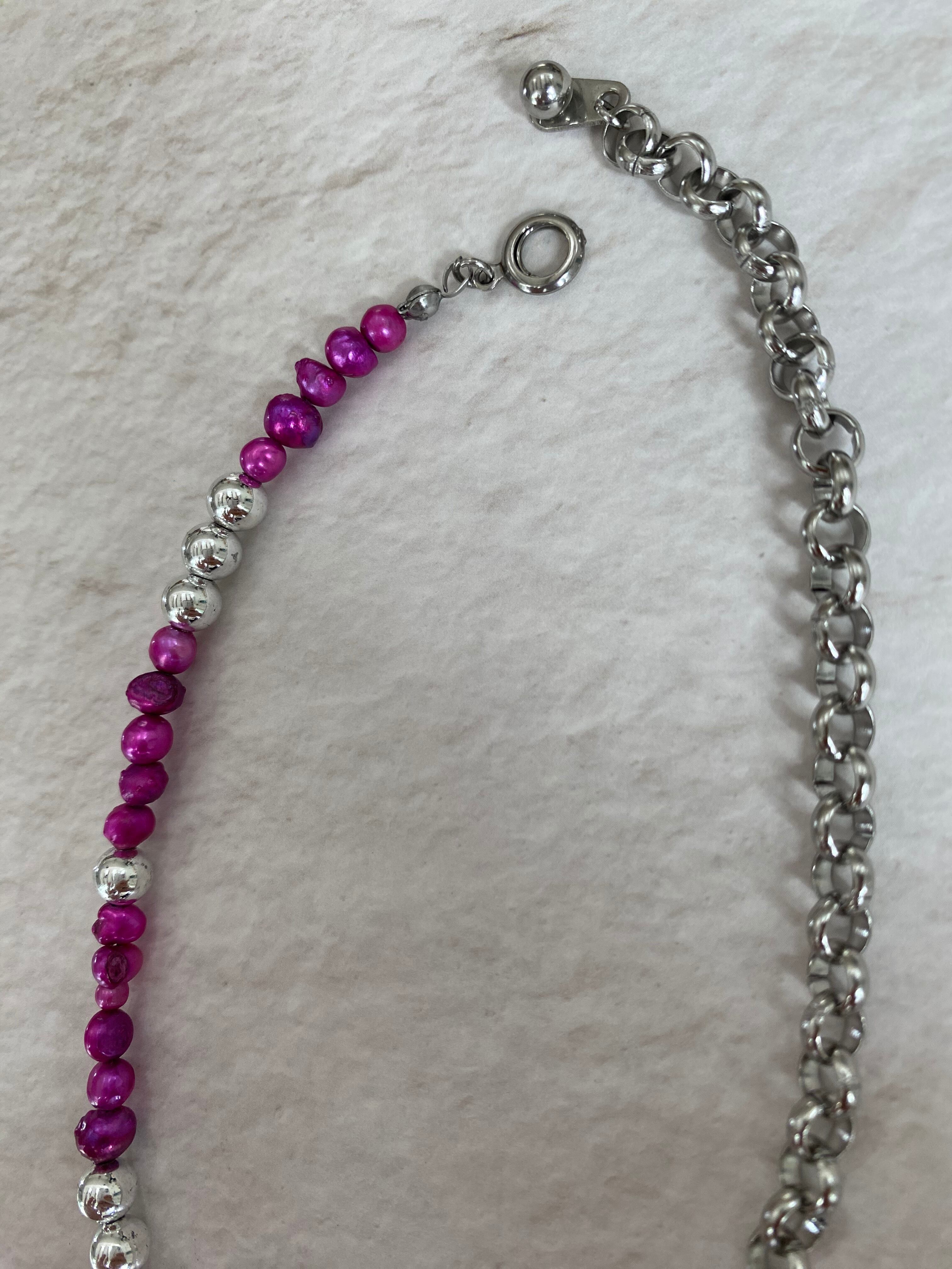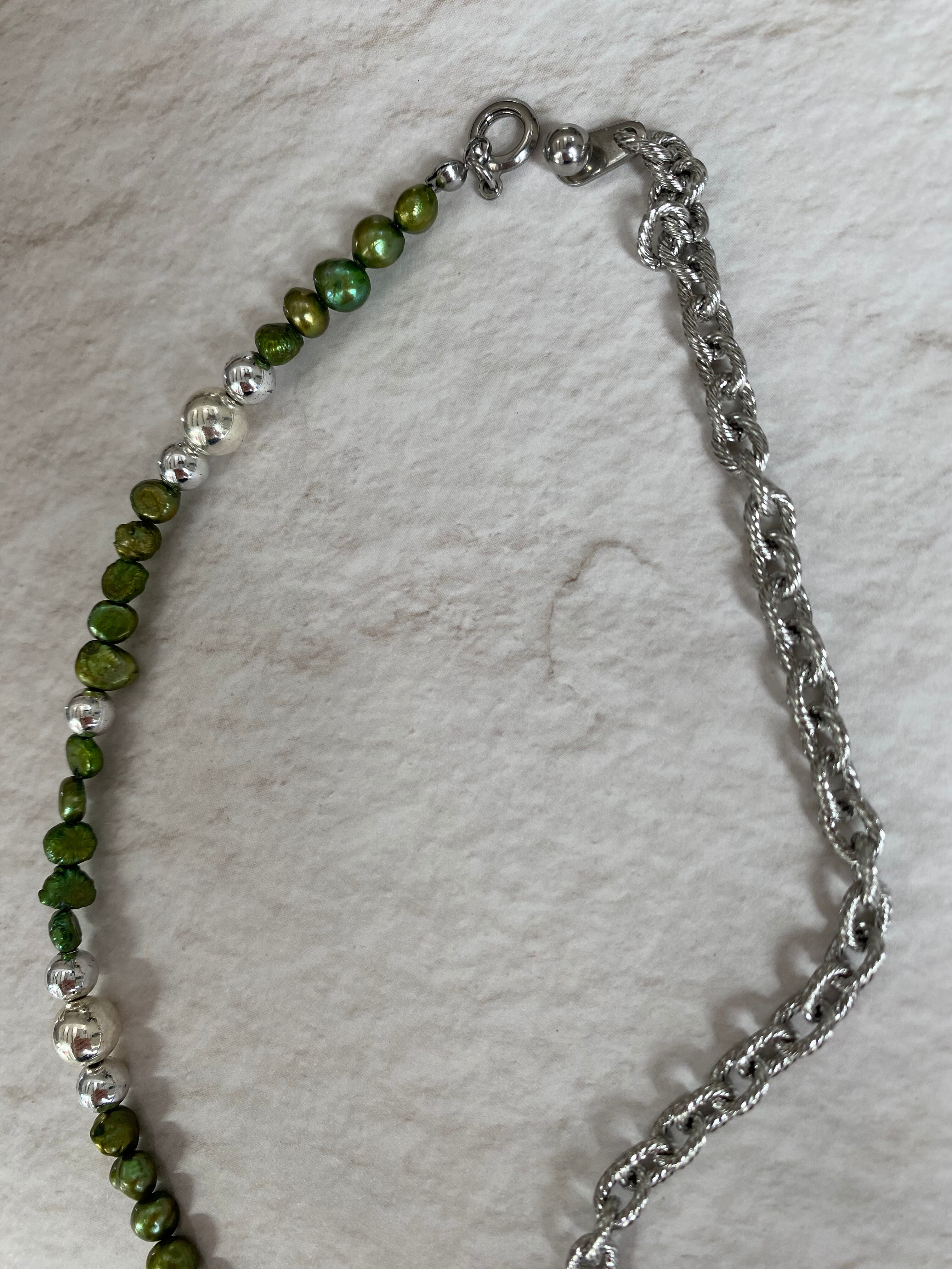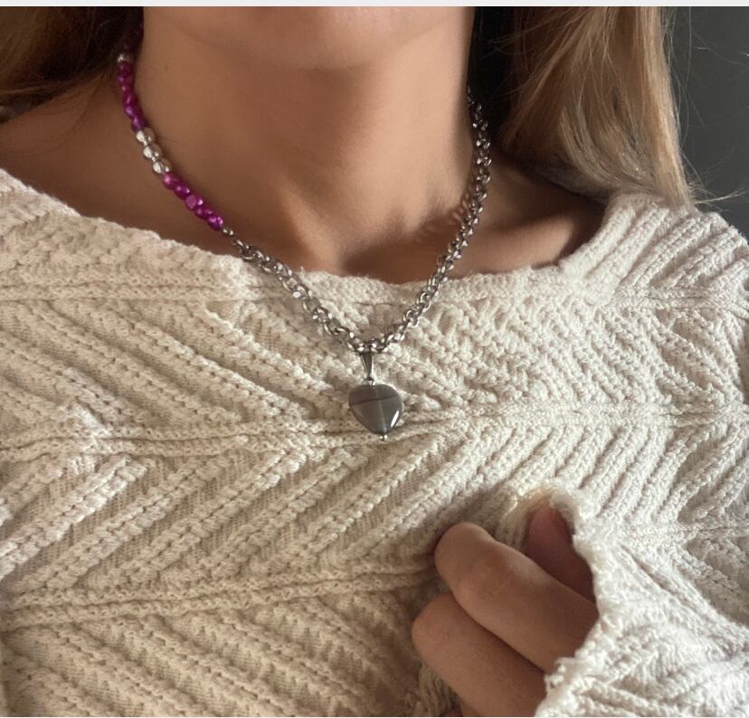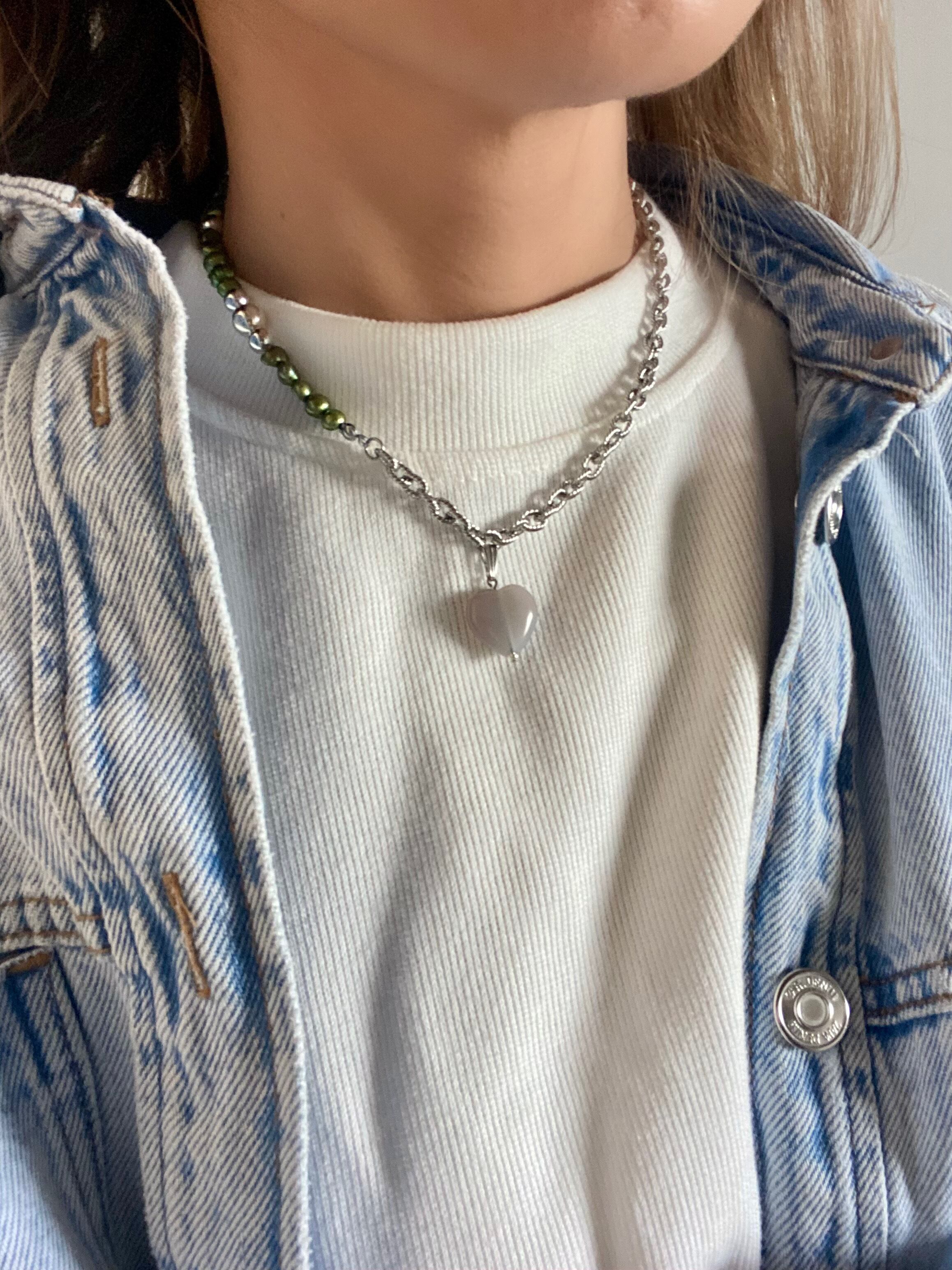 ハートのグレーアゲート、チェーンとカラー淡水パールを使用したネックレスです。