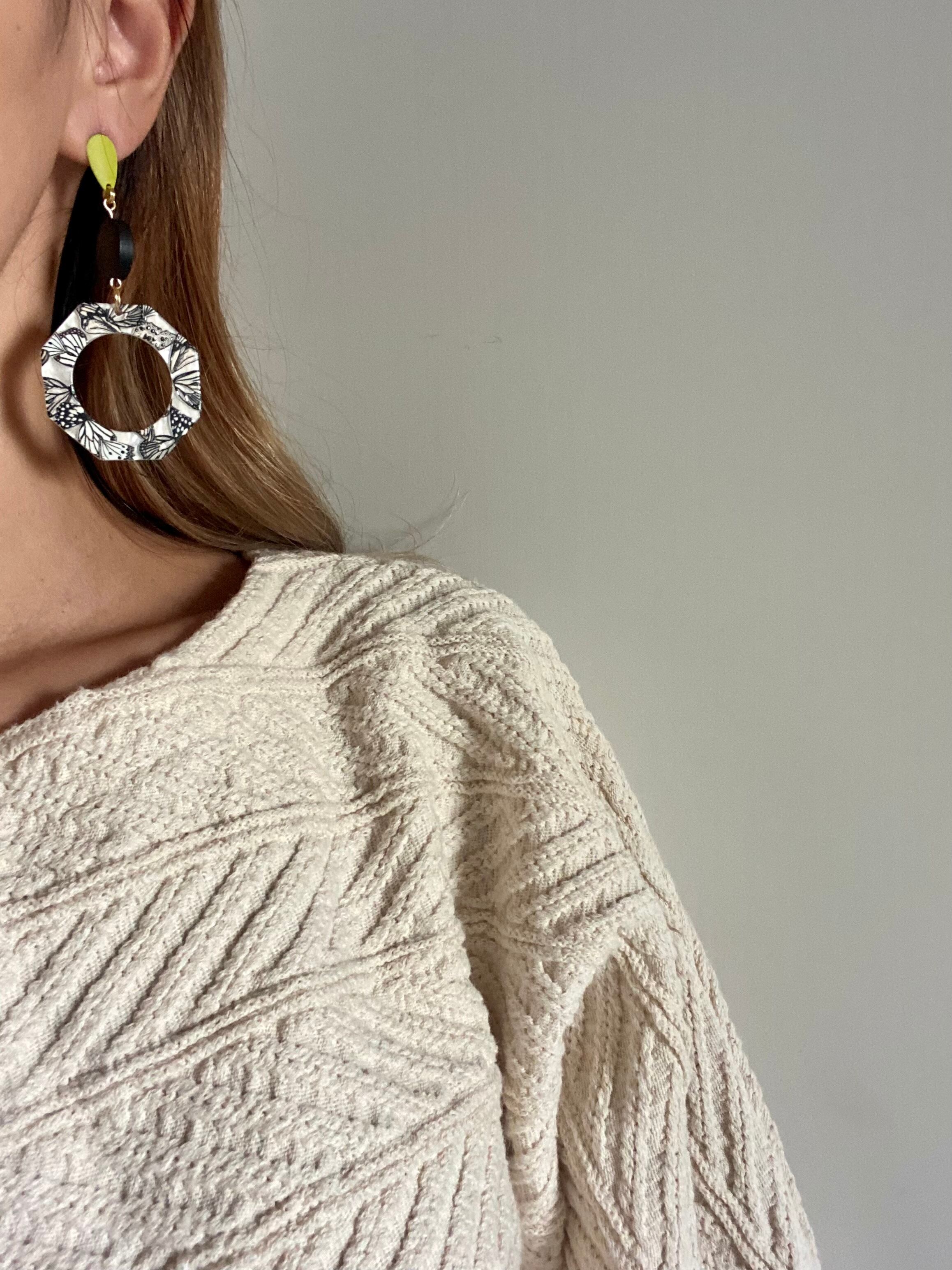 ライトグリーンがアクセントになっていて、ブラックのビーズはウッド調になっています。