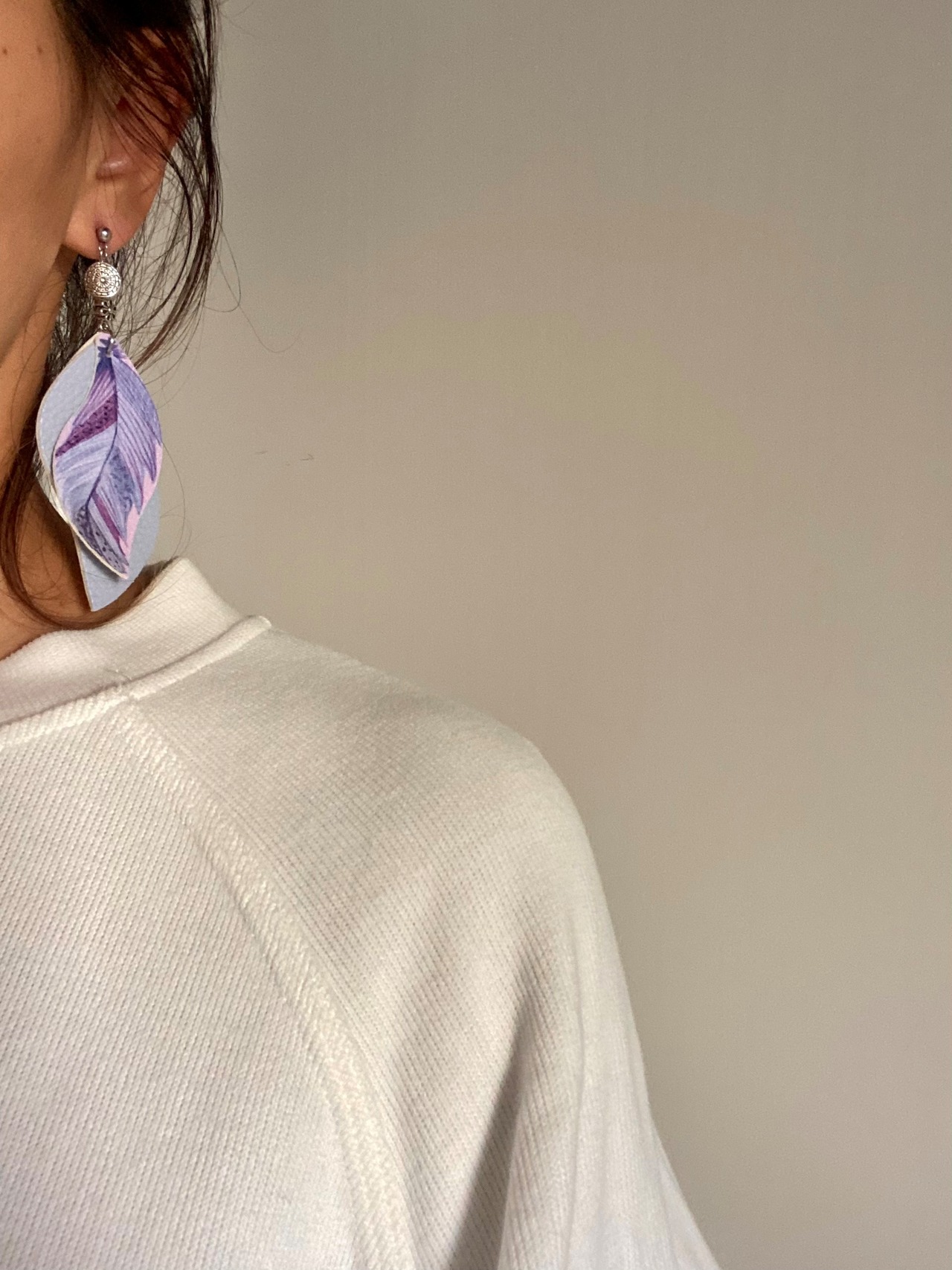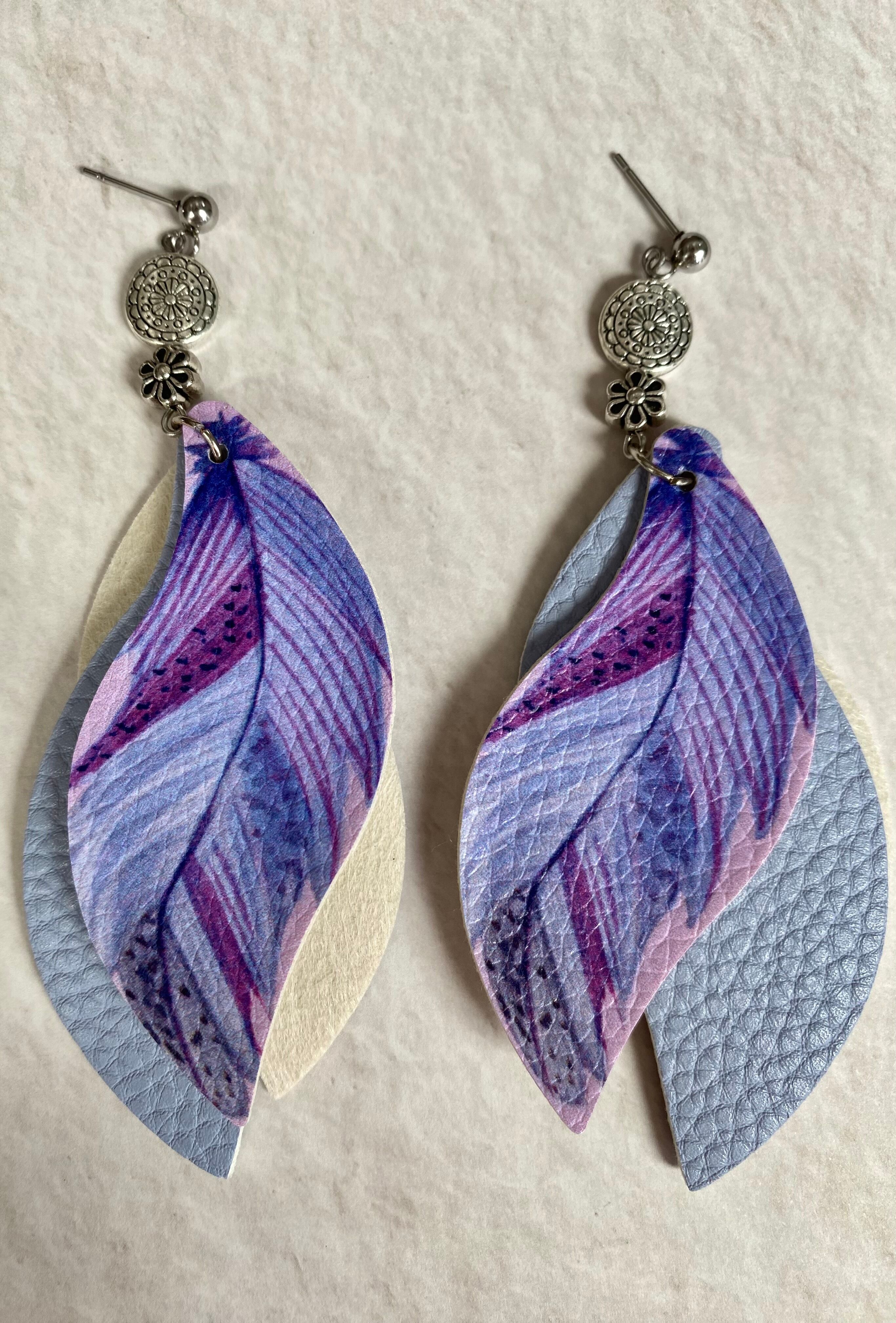 PUレザーのリーフ柄でパープル系のワントーン配色のチャームが可愛いピアスです。