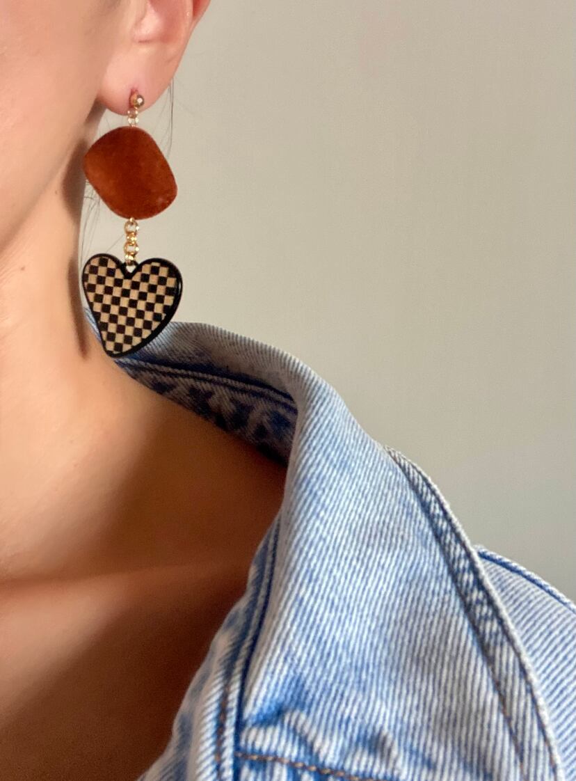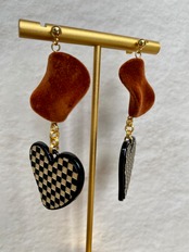 ウッドのチェックハートがゆらゆら可愛いピアスです。