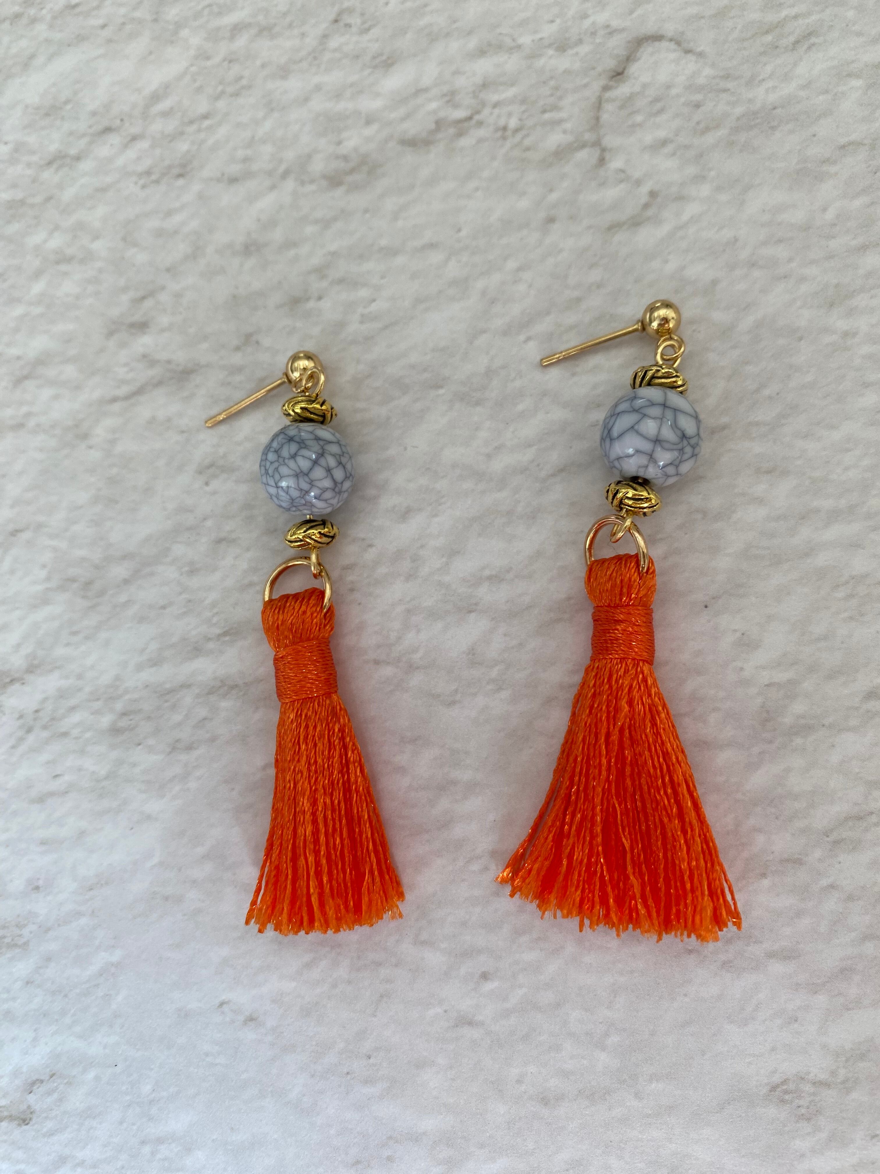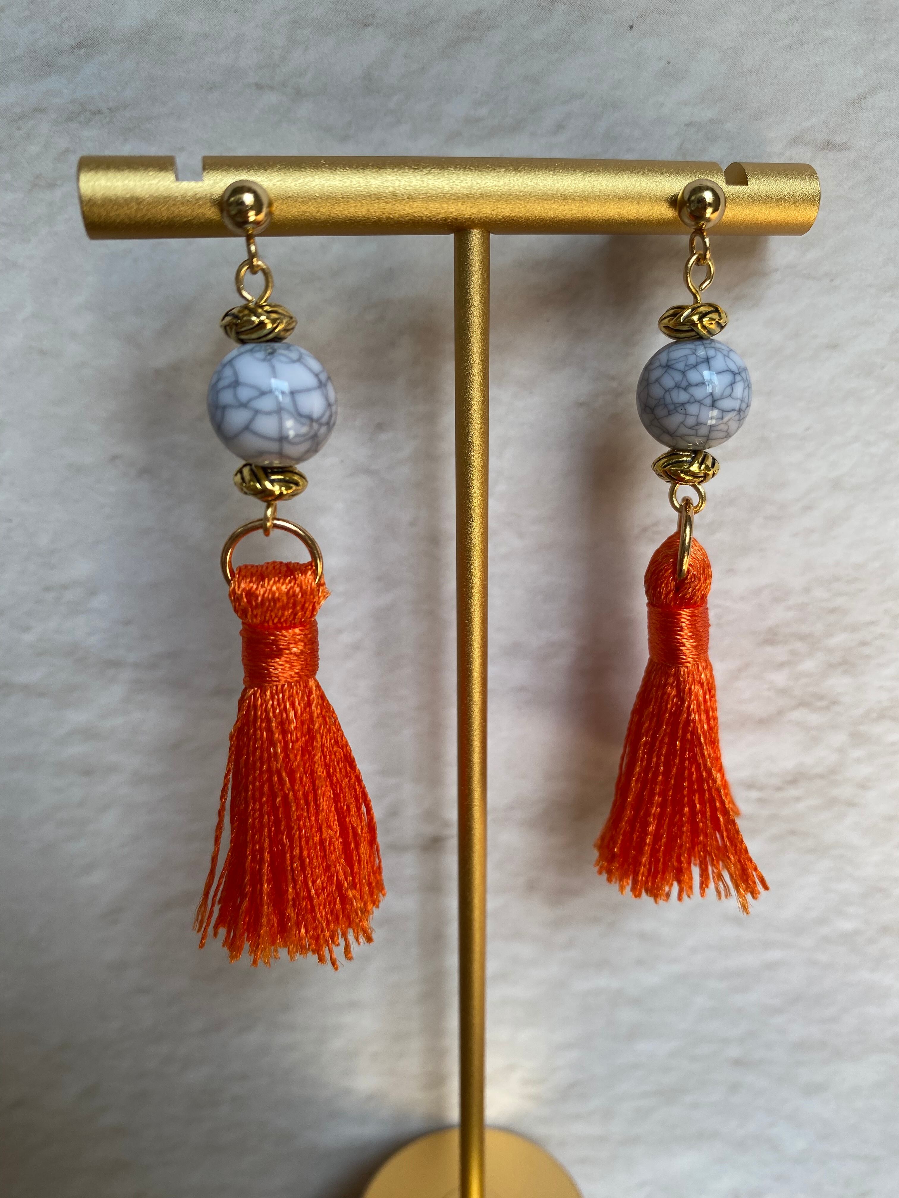 コーデの差し色にぴったりなオレンジのフリンジピアスです。